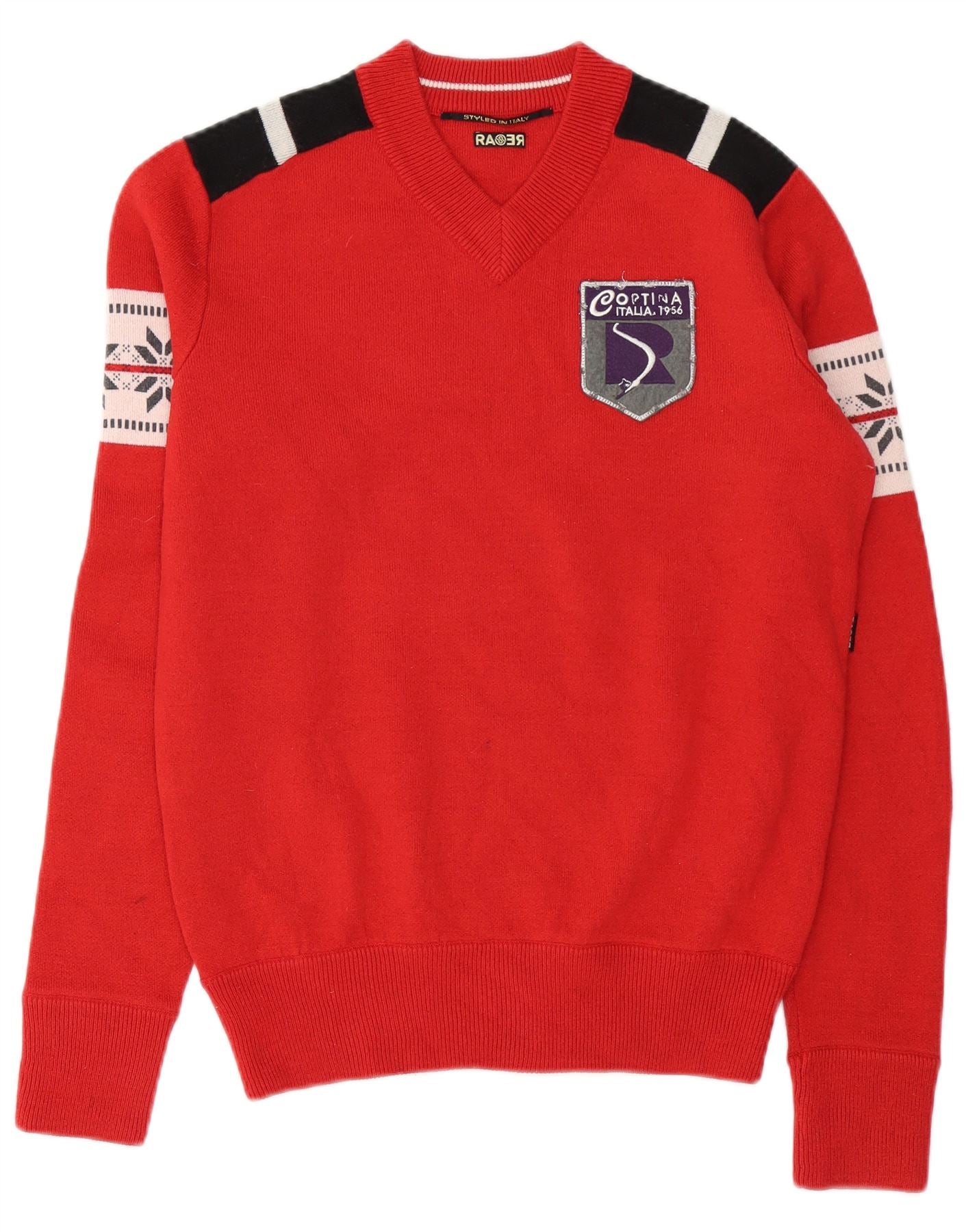 - AI Description: This RA39 mens V-neck jumper is crafted from a comfortable acrylic and wool blend knit. Its rich red hue offers a bold look. The V-neckline and long sleeves provide a classic silhouette. A regular fit ensures ease of movement and comfort. This pullover features a distinctive graphic and logo, celebrating the Italia Team for skiing. It combines warmth with a sporty, refined style.