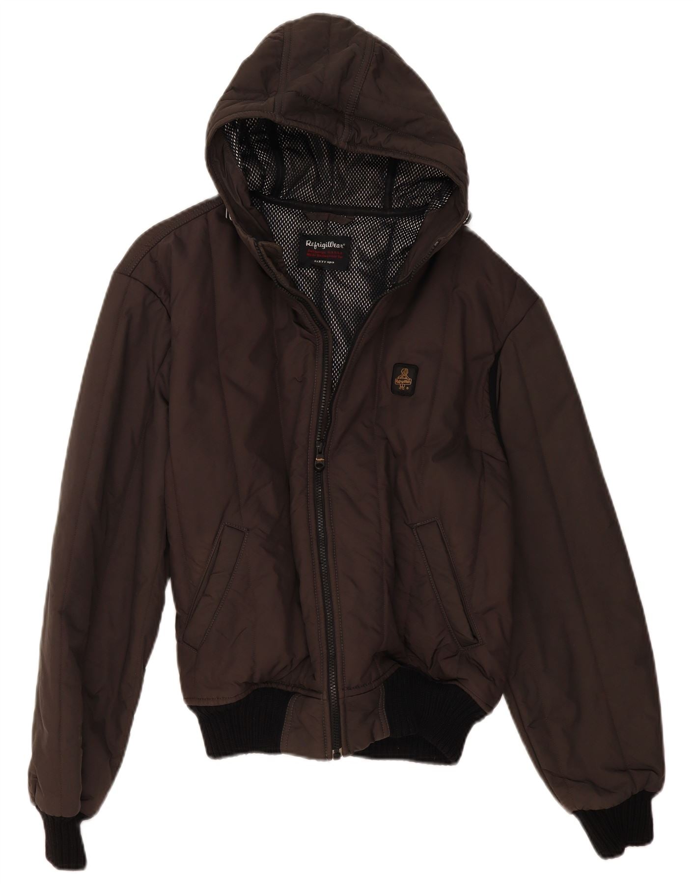 - AI Description: This Refrigiwear mens bomber jacket is crafted from a durable blended fabric, offering a padded, thermal design. It features a regular fit and long sleeves for comfortable wear. The hooded neckline provides extra warmth. A full zip closure secures the front, complemented by practical pockets. A subtle logo accent adds a modern touch. This jacket combines functional warmth with a contemporary style, perfect for colder weather.