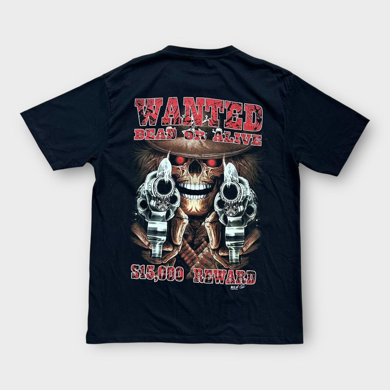 Tricou cu craniu de la începutul anilor 2000 „Wanted dead or alive” cu imprimeu pe piept și pe spate pe o etichetă sălbatică. Are si detalii metalice in fata