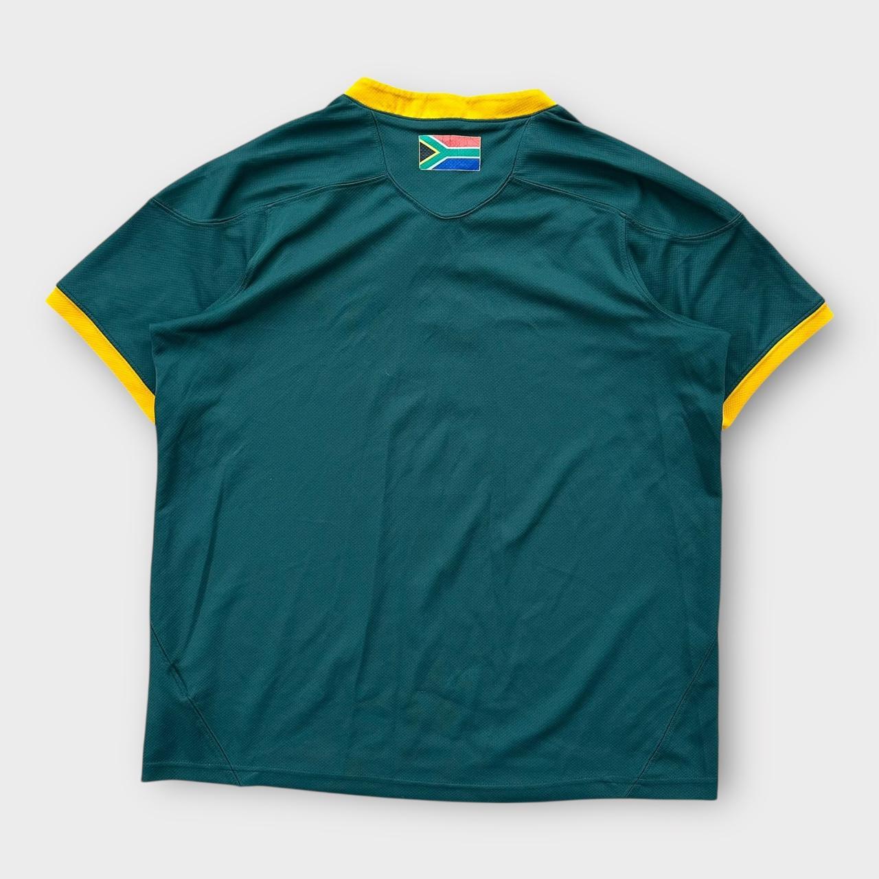 Tricou de rugby din Africa de Sud de la ASICS în verde și galben, cu sigle brodate și sponsor pe piept
