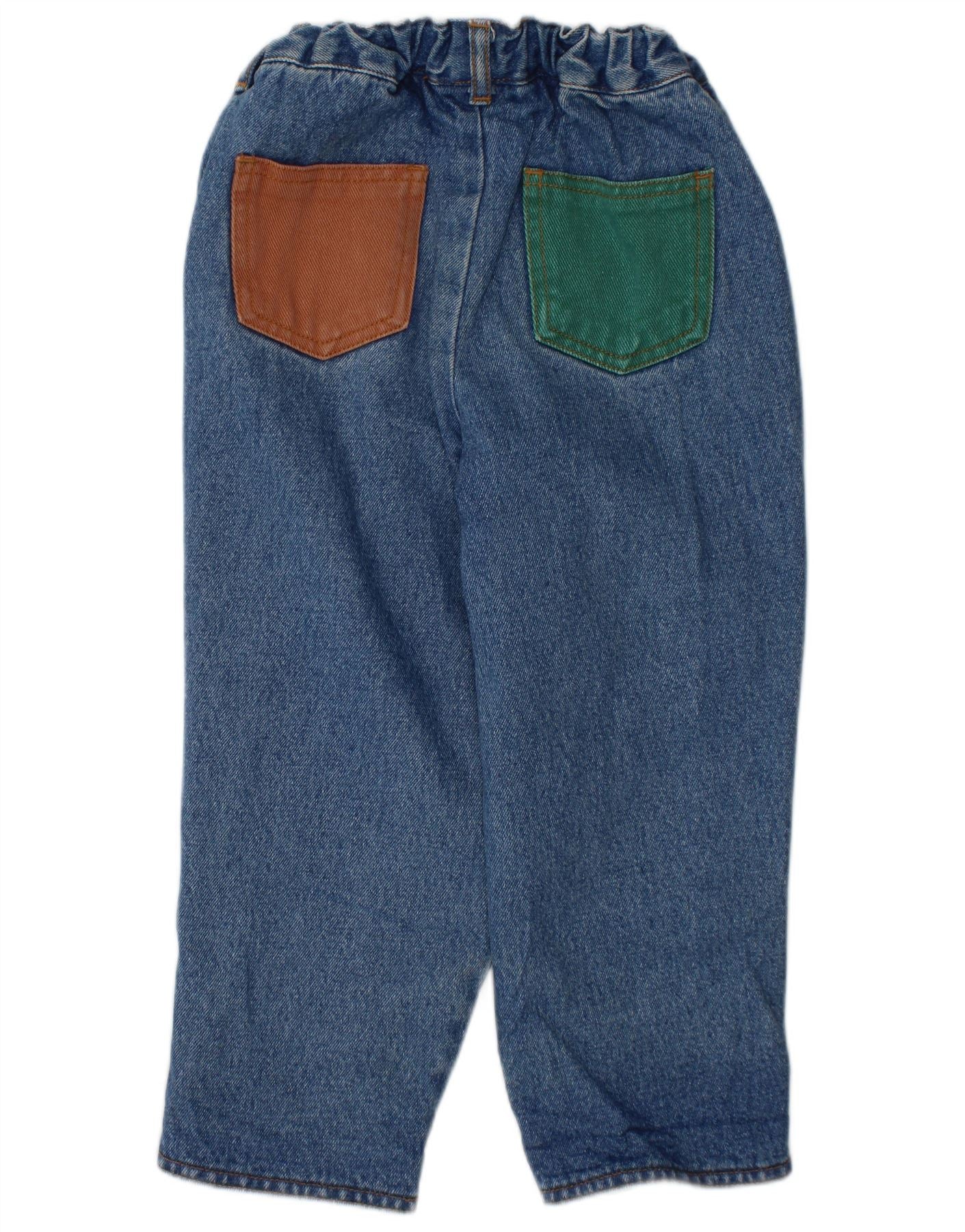 - AI Description: These St Michael boys jeans are crafted from durable denim, offering a comfortable feel. They feature a vibrant colourblock pattern in shades of blue, green, and brown. The pull-on design includes an elastic waist for an easy, relaxed fit. Practical pockets add functionality. A subtle logo provides a branded detail. This colourful style ensures both comfort and playful appeal for everyday wear.