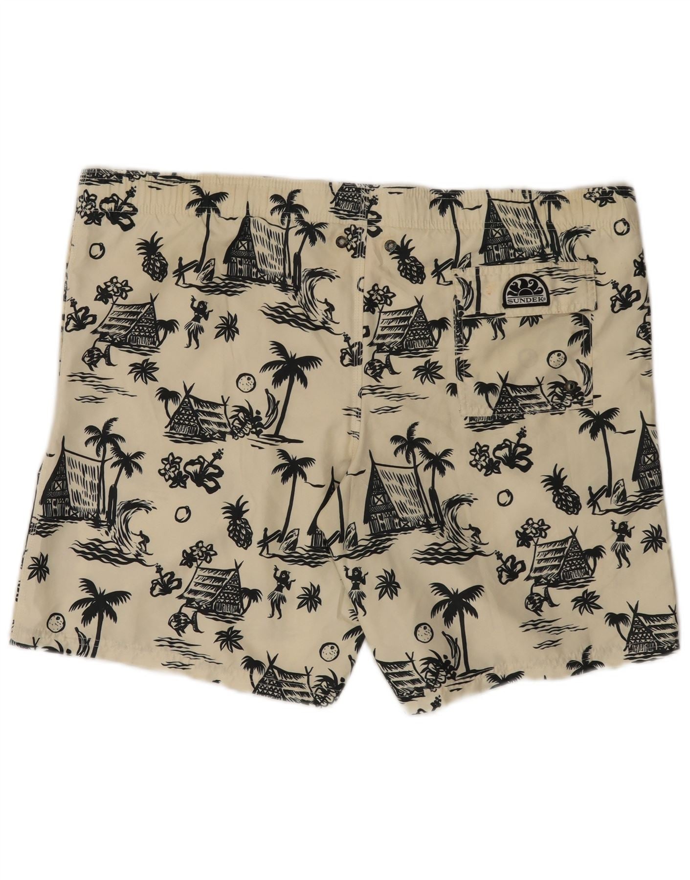 - Descriere AI: Acesti pantaloni scurți de înot Sundek pentru bărbați sunt confecționați din țesătură ușoară 100% poliester. Acestea au o bază de culoare albă, cu un imprimeu hawaian negru izbitor. Potrivirea obișnuită și talia elastică asigură confort. Închiderea cu șnur asigură o potrivire reglabilă. Sunt incluse buzunare practice. Un logo subtil Sundek adaugă o notă de marcă.