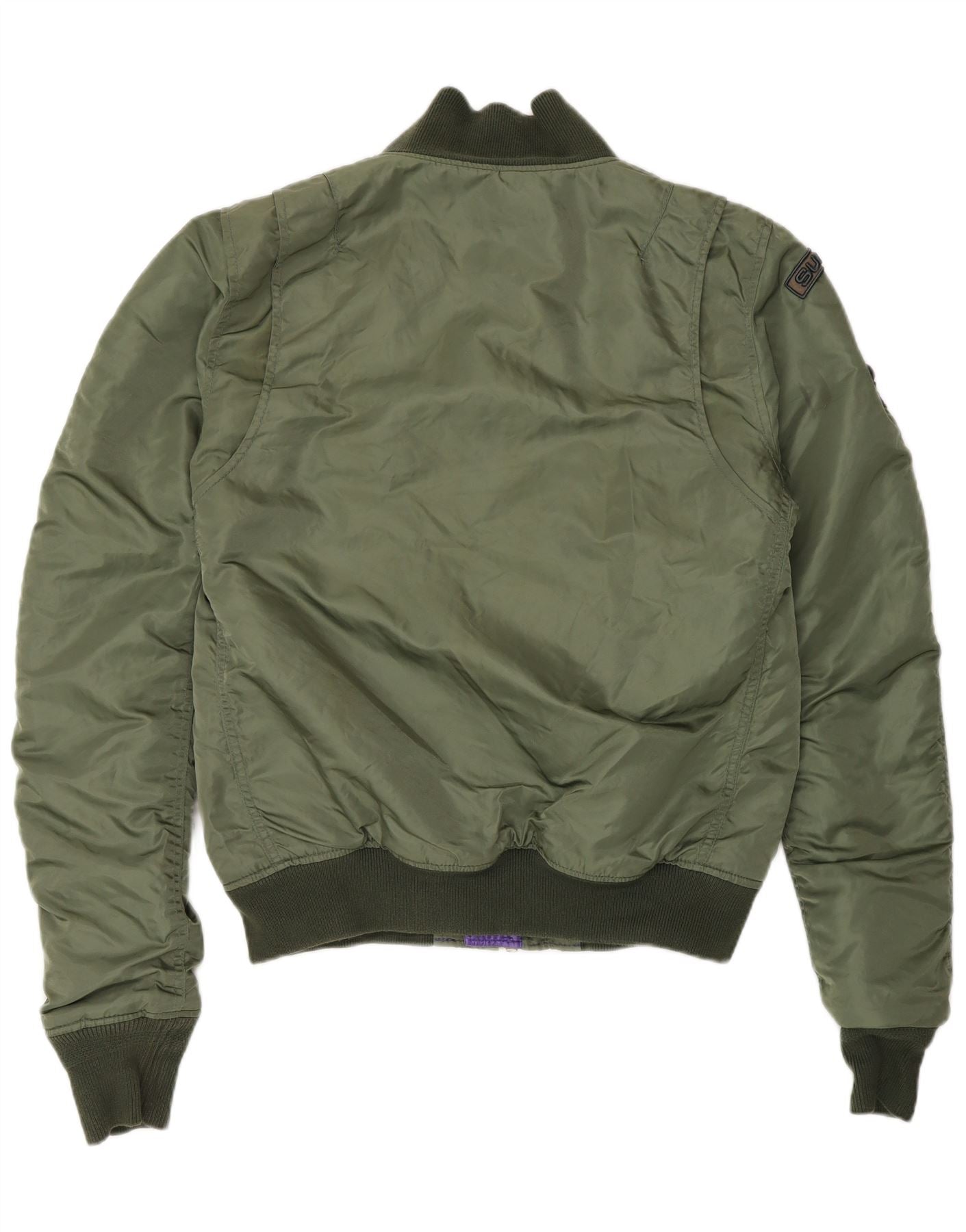 - AI Description: This Superdry womens bomber jacket is crafted from durable green nylon, offering a classic padded design. It features a collared neckline and long sleeves for a timeless silhouette. A full zip closure secures the front, complemented by practical pockets. The regular fit ensures comfortable wear, while the lined interior adds warmth. This jacket combines functional details with a clean, classic style.