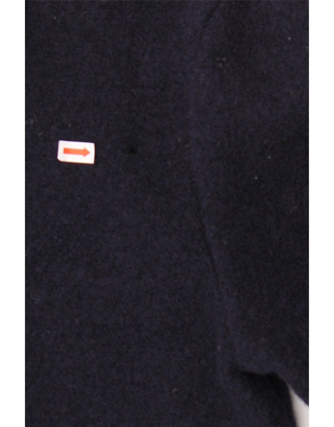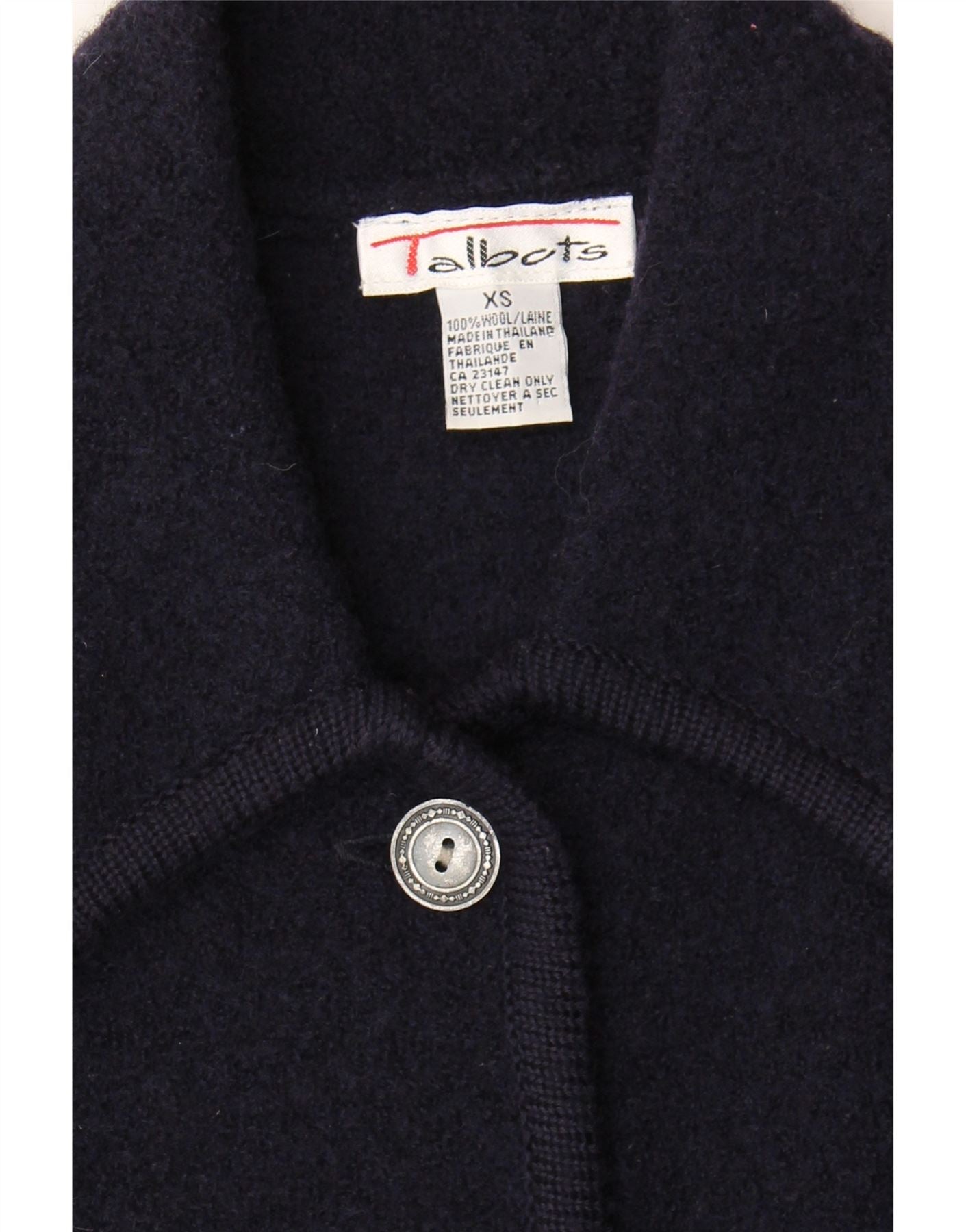 - AI Description: This is a pre-owned Talbots jacket crafted from 100% wool in a classic navy blue. The woven wool jacket features long sleeves, a collared neckline, and a regular fit. It has button closure and button accents. Design features include pockets and a collared style. The jacket is labelled as size XS and is in good condition, although it has minor visible wear on the front. To care for this item, it should be dry cleaned only.