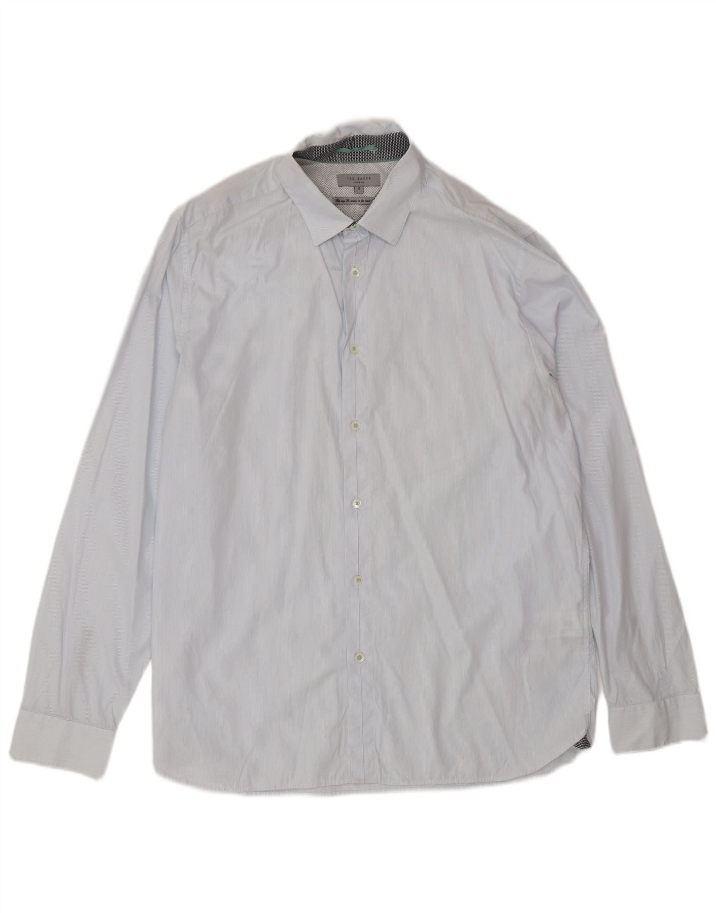 - Descriere AI: Această cămașă pentru bărbați Ted Baker este confecționată din material țesut 100% bumbac. Are un model subtil în dungi albastre. Decolteul cu guler și fața cu nasturi complet oferă un aspect clasic. Mâneci lungi finisate cu manșete cu nasturi. Potrivirea obișnuită asigură o purtare confortabilă. Detaliile interioare ale gulerului adaugă o notă de semnătură. Această cămașă combină stilul atemporal cu confortul rafinat pentru orice ocazie.