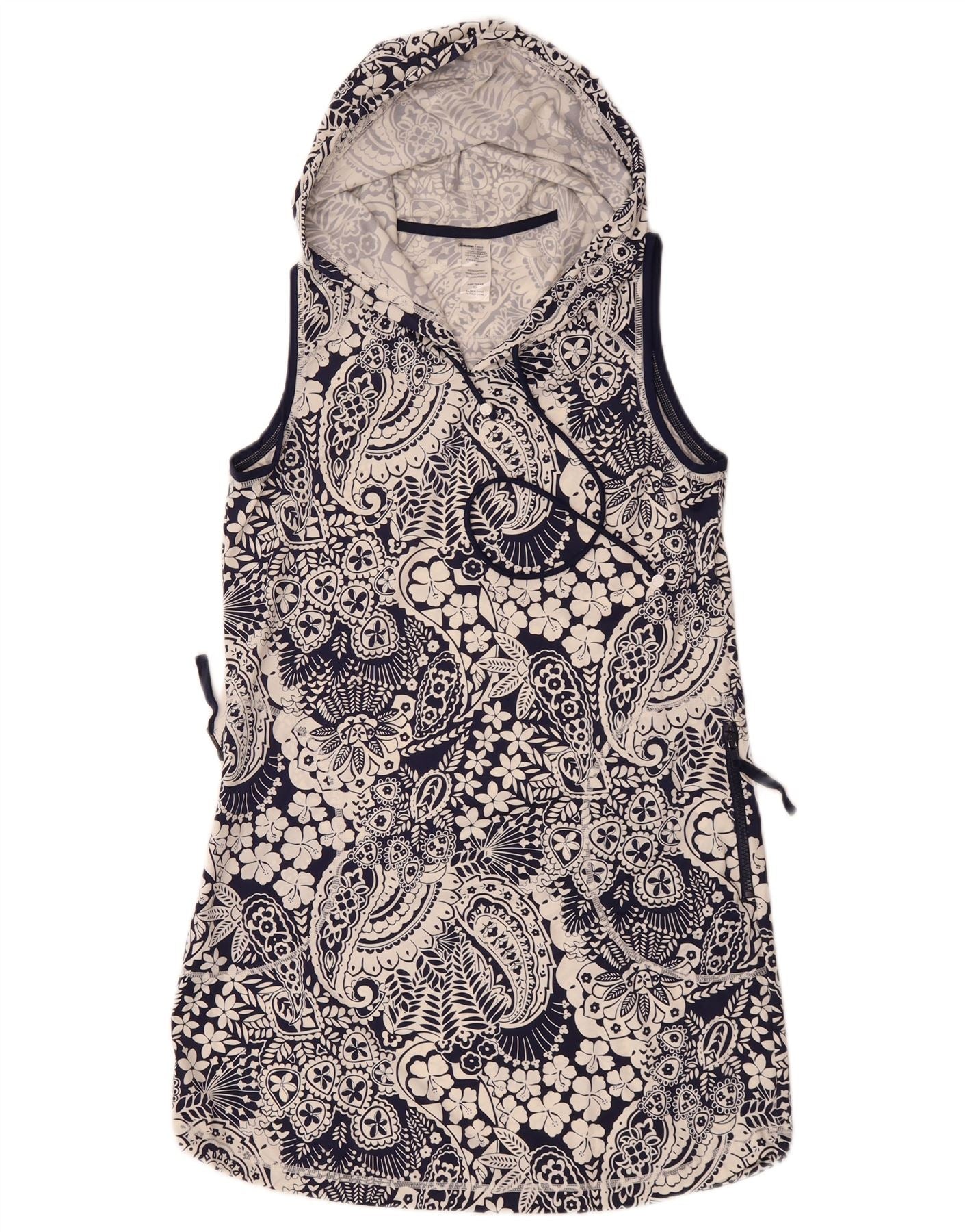 - Descriere AI: Această rochie cu glugă pentru femei Tommy Bahama este confecționată dintr-un amestec moale de jerseu de poliester. Are un model Paisley multicolor vibrant, predominant bleumarin și alb. Designul fără mâneci oferă o potrivire relaxată. Include o glugă practică și buzunare convenabile. Stilul pulover asigură o purtare ușoară. Această rochie cu ajustare normală întruchipează o estetică boemă.