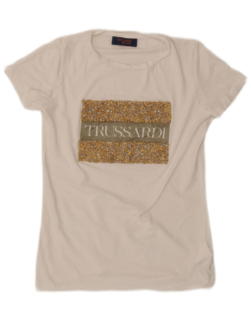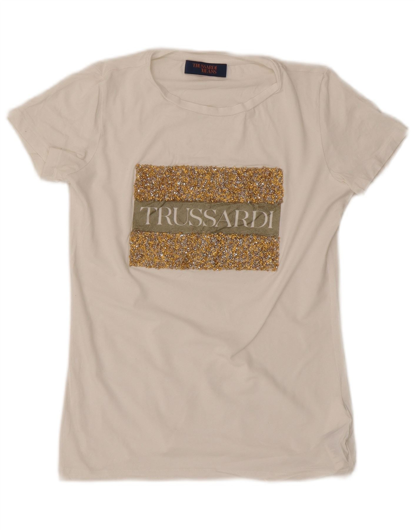 TRUSSARDI JEANS Womens Graphic T-Shirt Top UK 12 Medium White Cotton