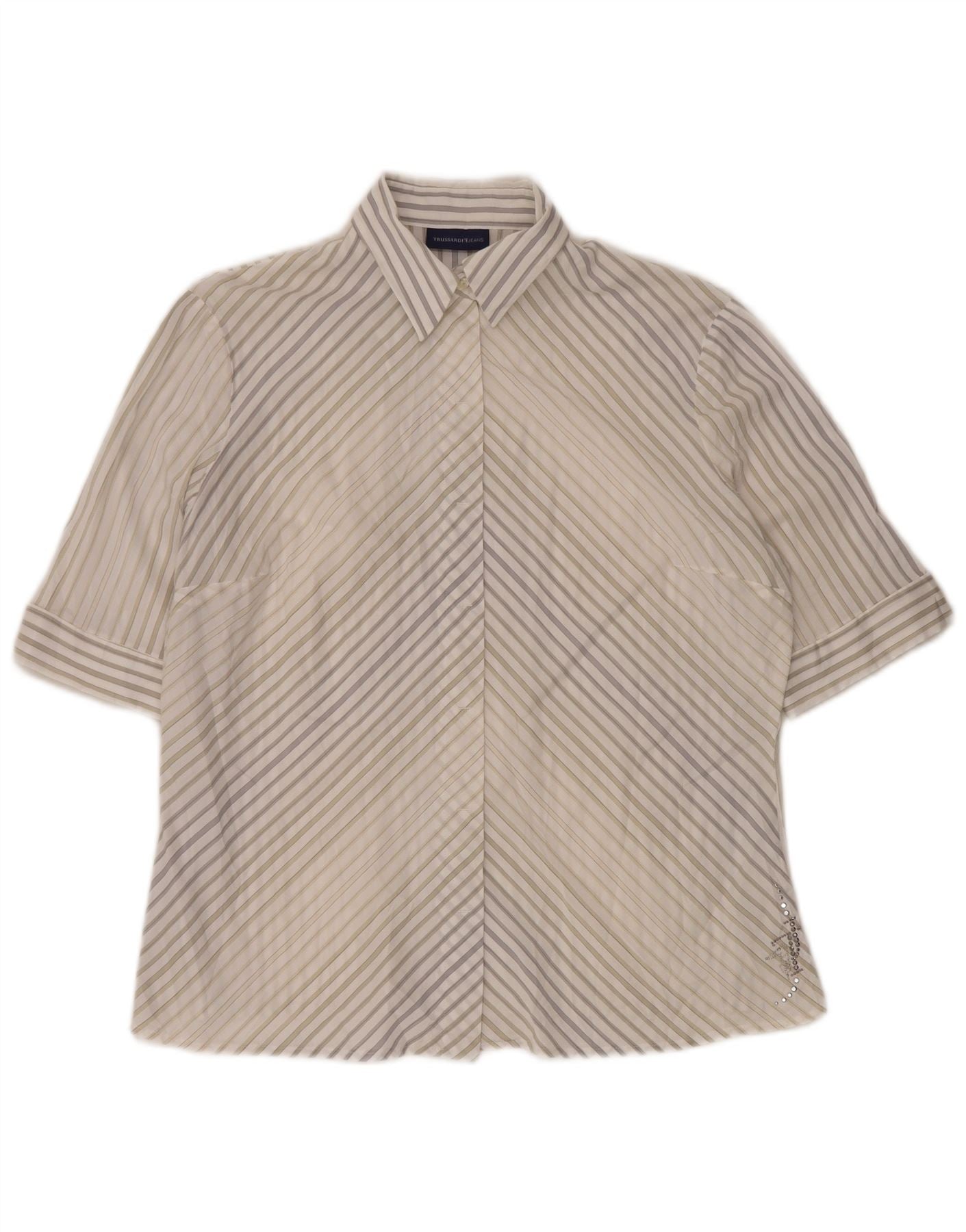 Bluză cămașă cu mânecă scurtă pentru femei TRUSSARDI JEANS UK 22 3XL alb cu dungi