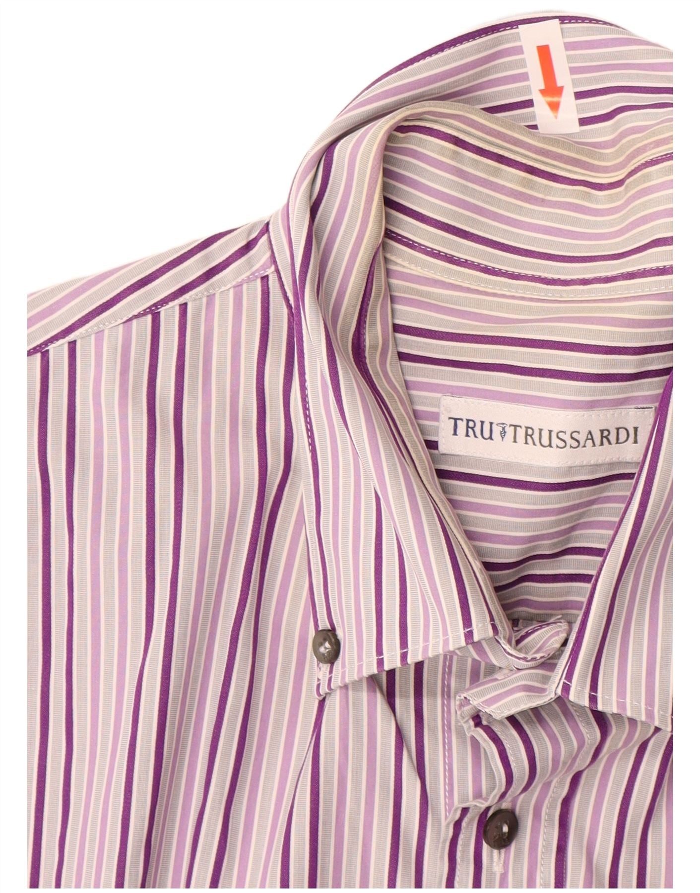 - Descriere AI: Această cămașă pentru bărbați Trussardi este confecționată dintr-o țesătură, oferind o textură clară. Are un model distinctiv cu dungi în nuanțe de violet, liliac și gri. Decolteul cu guler și închiderea cu nasturi oferă un aspect clasic. Mânecile scurte și o potrivire obișnuită asigură confort și ușurință la purtare. Un singur buzunar la piept adaugă detalii practice. Această cămașă oferă un stil inteligent, dar relaxat.