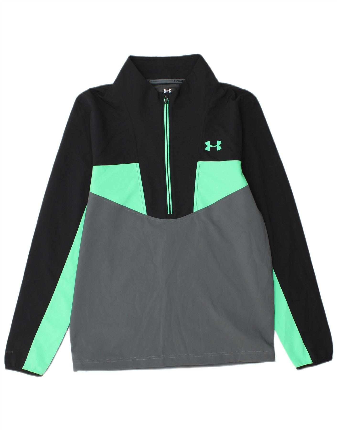 - Descriere AI: Acest top de trening Under Armour pentru bărbați este confecționat din țesătură ușoară, respirabilă. Are un gât înalt și mâneci lungi. Potrivirea relaxată, lejeră, asigură confort și libertate de mișcare. Închiderea cu fermoar și modelul colorblock în negru, gri și verde adaugă o estetică modernă și sportivă. Logo-ul Under Armour oferă un accent subtil. Acest top este ideal pentru golf sau alte activități active.