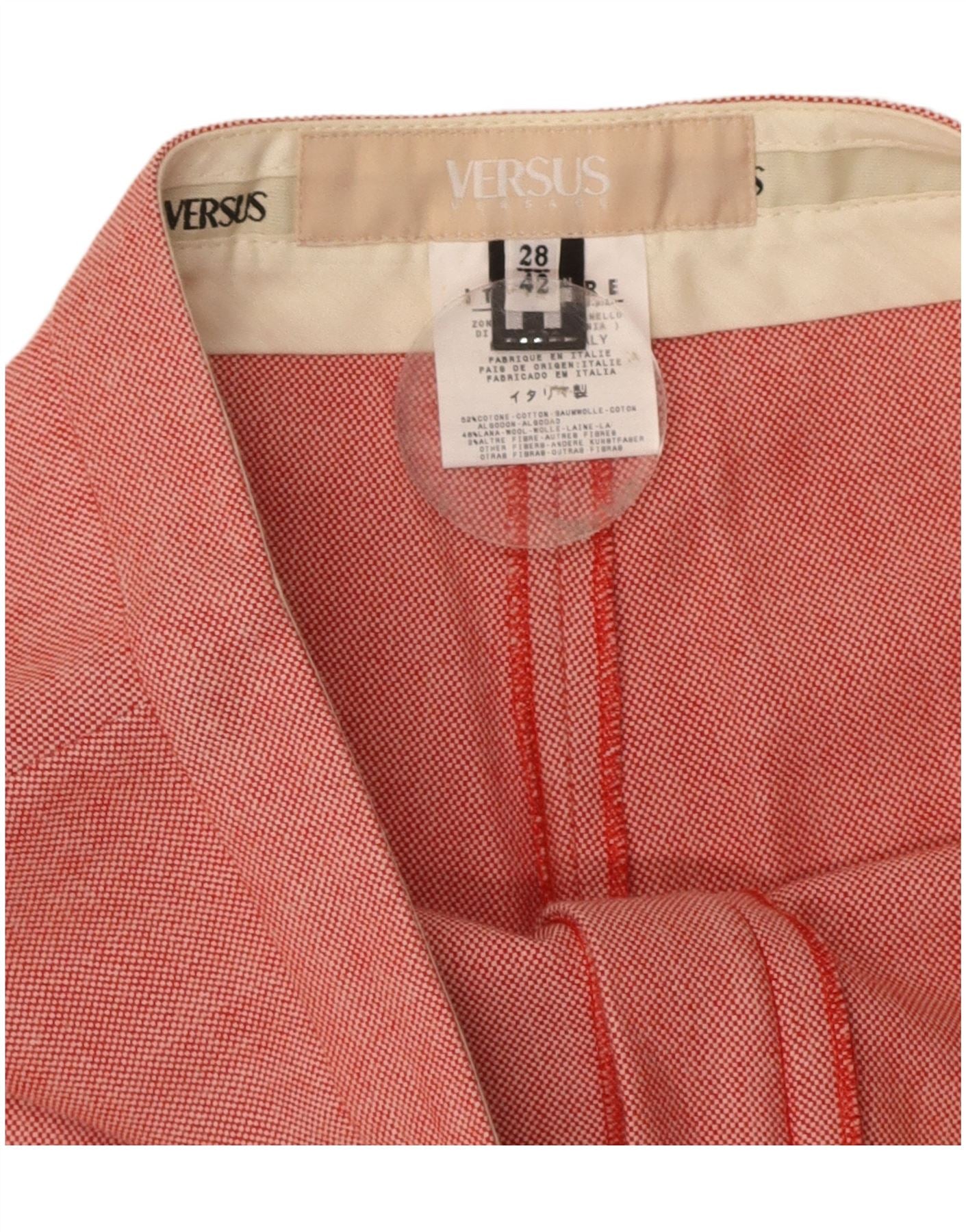 - AI Description: These Versus Versace women's trousers are crafted from a rich red cotton blend, offering a comfortable woven texture with a hint of stretch. They feature a regular fit and a straight leg silhouette for a classic look. A zip closure ensures a smooth front. Practical pockets are included, and subtle ankle zips add a modern, designer touch.