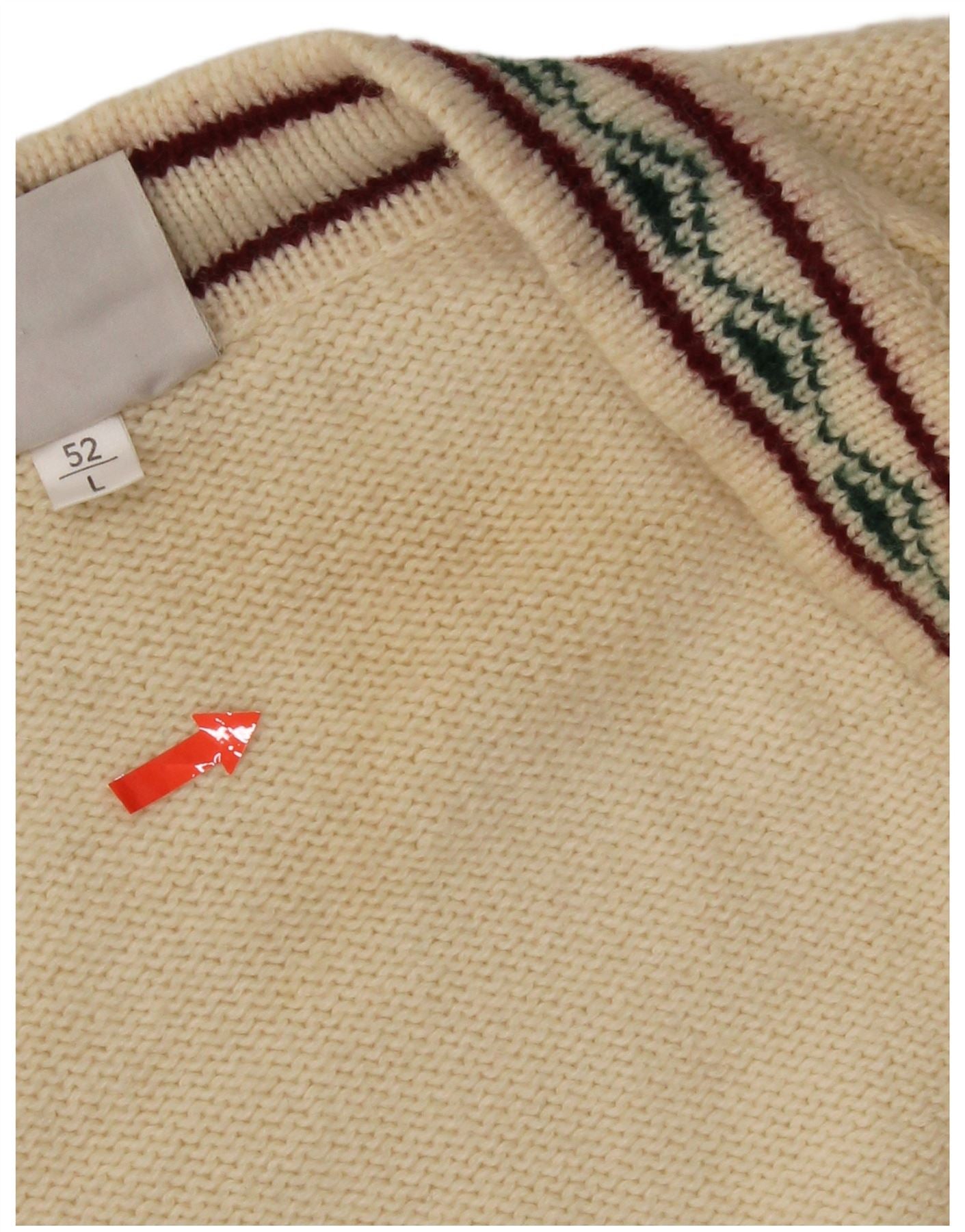 - Descriere AI: Acest pulover cardigan Vintage pentru bărbați este confecționat dintr-un tricot confortabil din amestec de lână într-o nuanță de alb. Are un decolteu clasic în V și un nasturi complet în față. Mânecile lungi și corpul prezintă modele complicate de tricot cu cablu. Detaliile în dungi în maro și verde împodobesc pacheta, manșetele și tiv. Această îmbrăcăminte cu potrivire obișnuită oferă atât căldură, cât și un stil retro atemporal.