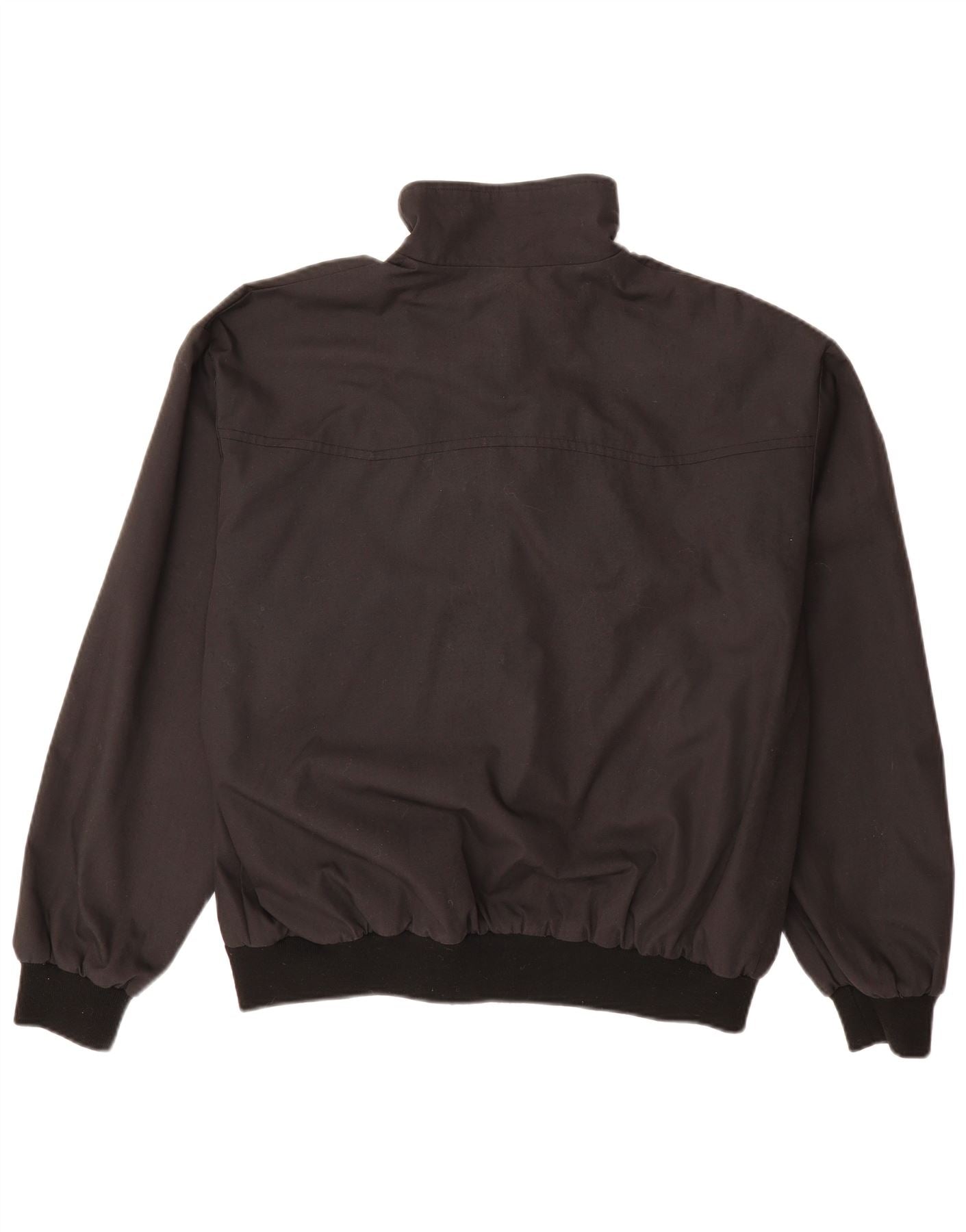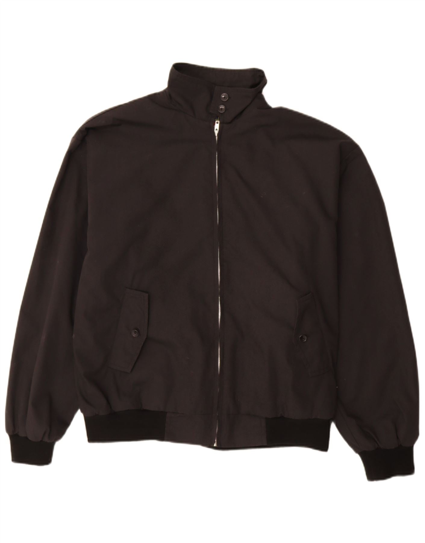 - AI Description: This Vintage mens Harrington jacket is crafted from a classic black woven fabric. It features a collared neckline and a full zip closure. Long sleeves end in cuffed detailing. The regular fit offers a comfortable silhouette. Practical pockets are included. An elasticated waist provides a neat finish. Subtle button accents complete the classic style. This timeless piece is perfect for everyday wear.