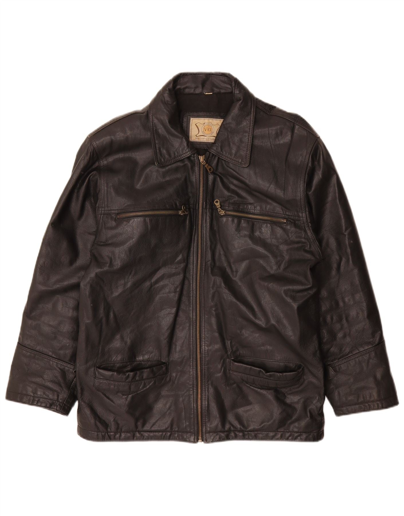 - Descriere AI: Această jachetă de piele Vintage pentru bărbați este realizată din piele neagră reală, oferind o textură clasică și durabilă. Are un decolteu cu guler și o închidere completă cu fermoar pentru un aspect atemporal. Mânecile lungi și o potrivire obișnuită asigură o purtare confortabilă. Buzunarele practice cu fermoar adaugă detalii funcționale, sporind stilul său clasic.