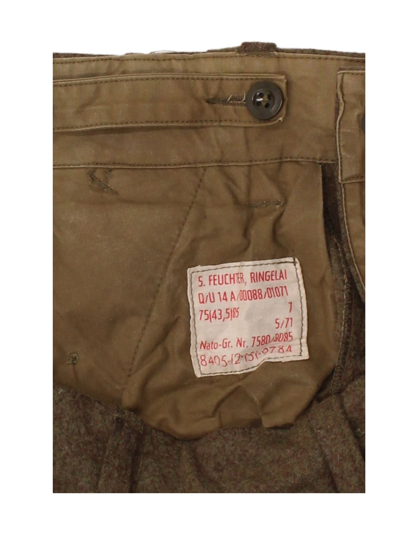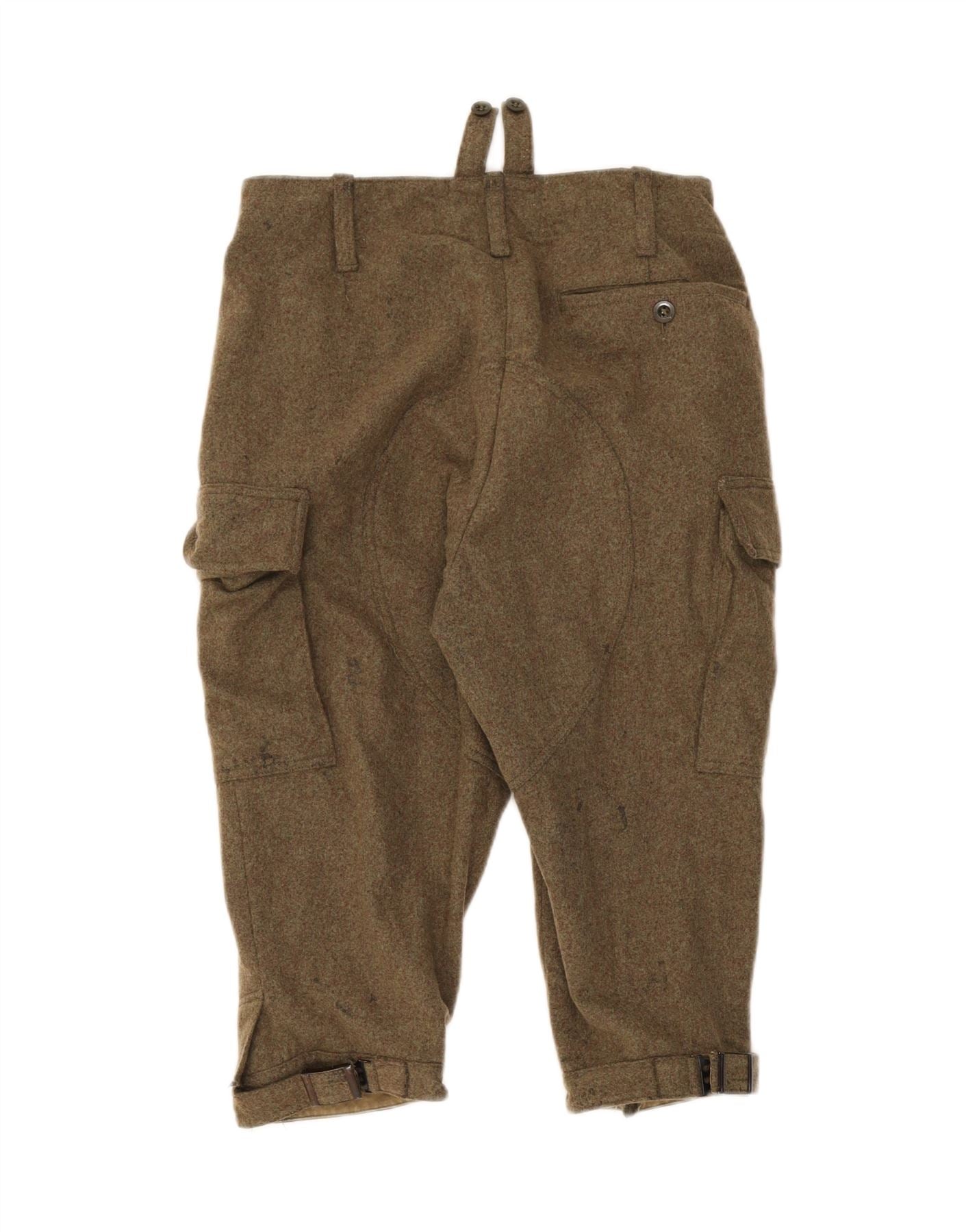 - AI Description: These Vintage men's cargo trousers are crafted from durable khaki woven fabric. They feature a regular fit and a secure button closure. Practical pockets offer utility and style. The design is finished with a smart cuffed hem, giving them a contemporary Capri-style length. This army-inspired piece combines rugged appeal with modern tailoring for versatile wear.