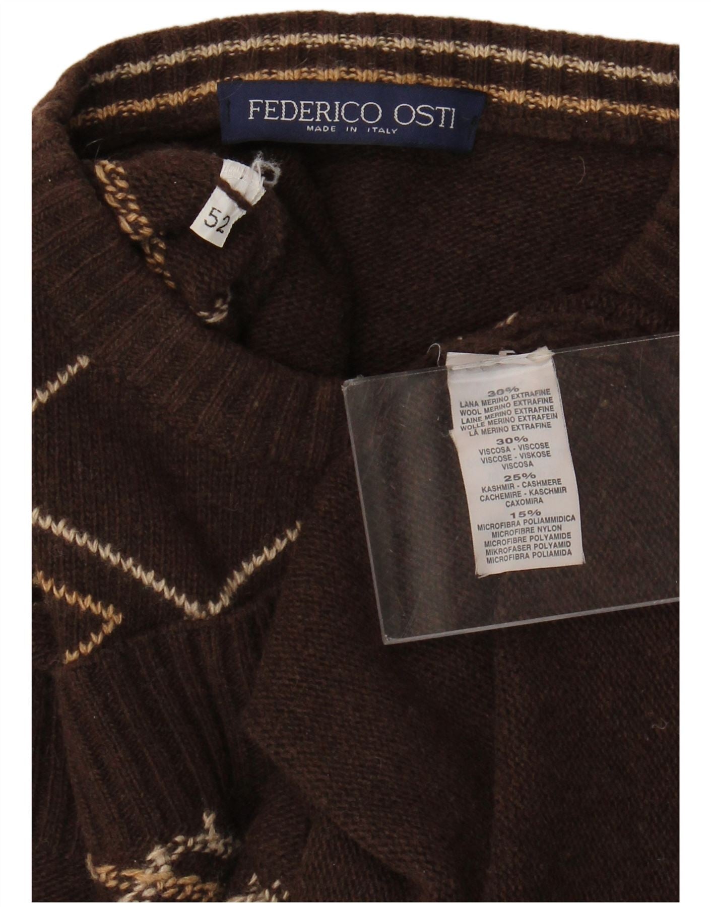 - Descriere AI: Acest pulover fără mâneci pentru bărbați Federico Osti este realizat dintr-un amestec luxos de lână extrafină merinos, viscoză, cașmir și poliamidă. Tricotul maro bogat oferă o senzație moale și confortabilă. Are un gât rotund clasic și o potrivire obișnuită. Un model distinctiv de diamante argyle în tonuri contrastante împodobește partea din față. Acest stil de pulover asigură o purtare ușoară, perfect pentru stratificarea versatilă.