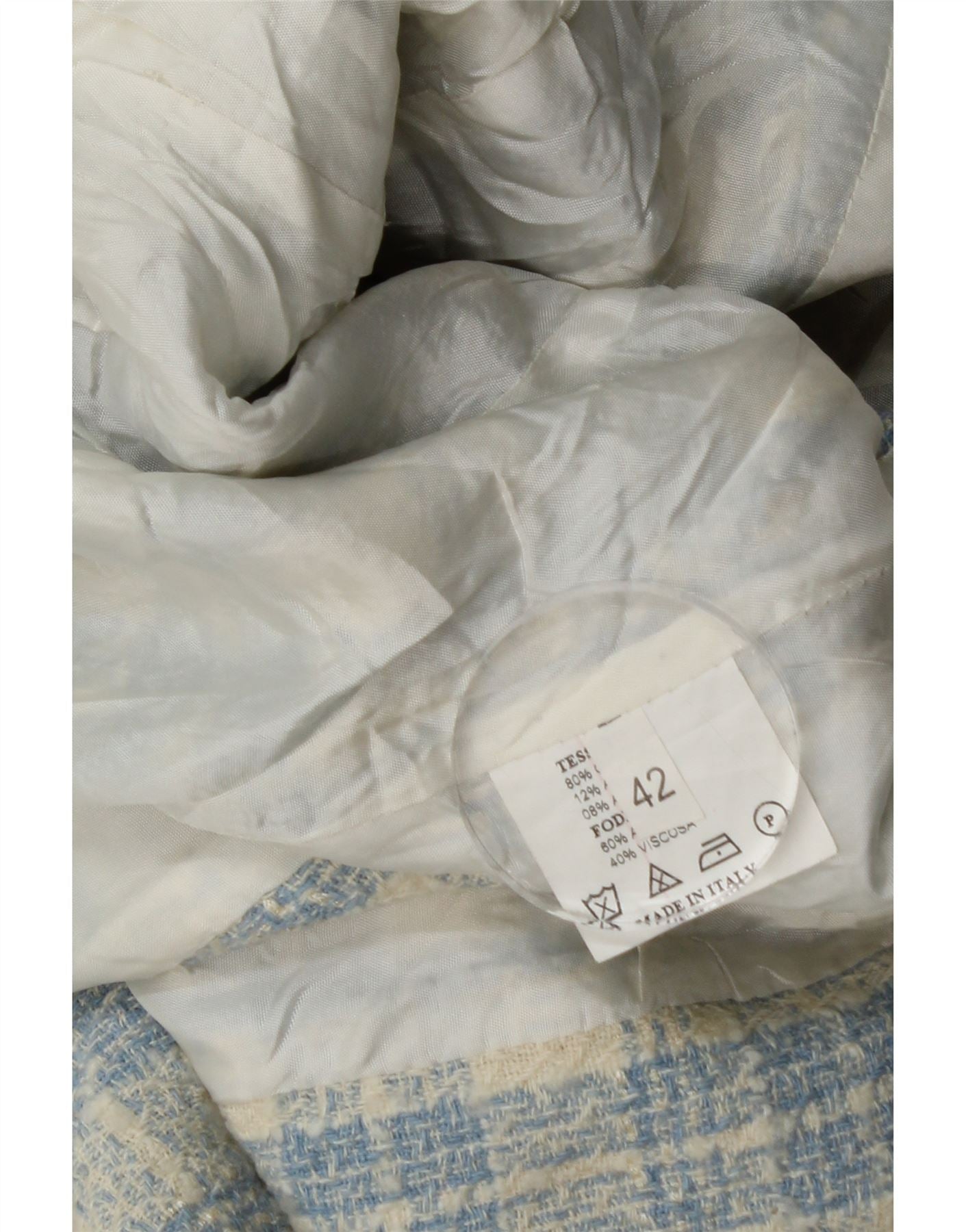 - Descriere AI: Acest blazer Vintage pentru femei este confecționat dintr-o țesătură tweed texturată, cu o țesătură în carouri albastru și alb murdar. Prezintă un decolteu clasic cu guler și mâneci lungi. Potrivirea obișnuită oferă o siluetă confortabilă. Închiderea cu nasturi frontale și buzunarele decorative cu clapă adaugă detalii tradiționale. Această jachetă căptușită întruchipează stilul atemporal.