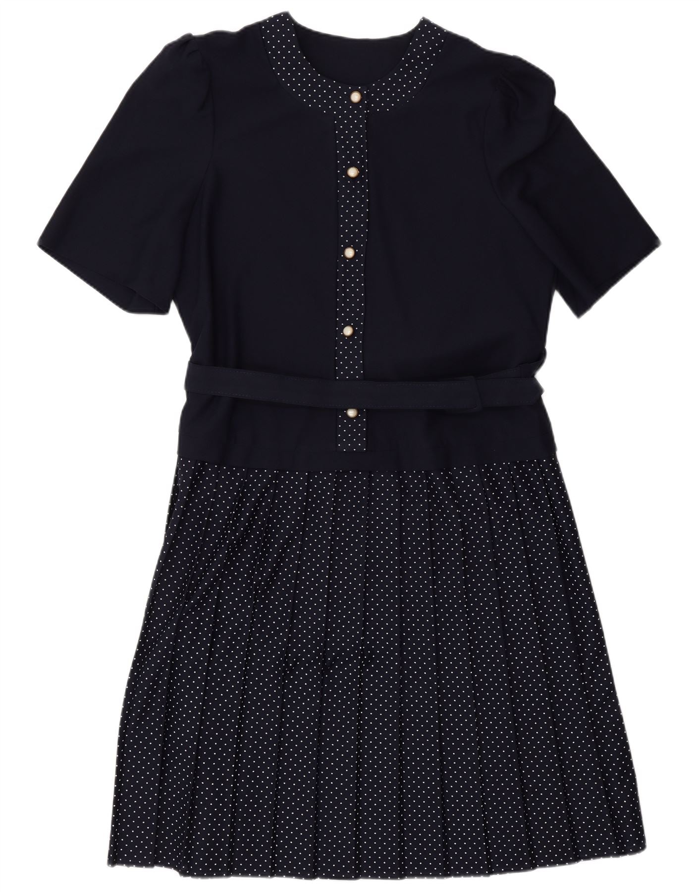 - Descriere AI: Această rochie Vintage pentru femei în linie A este realizată din țesătură 100% poliester, albastru bleumarin. Are un decolteu rotund și mâneci scurte. Partea superioară a corsetului și fusta plisată în linie A prezintă un model delicat de buline. Un nasturi în față cu nasturi decorativi detaliază corsetul. O curea asortată strânge talia. Potrivirea regulata ofera o silueta clasica, eleganta, potrivita pentru diverse ocazii.