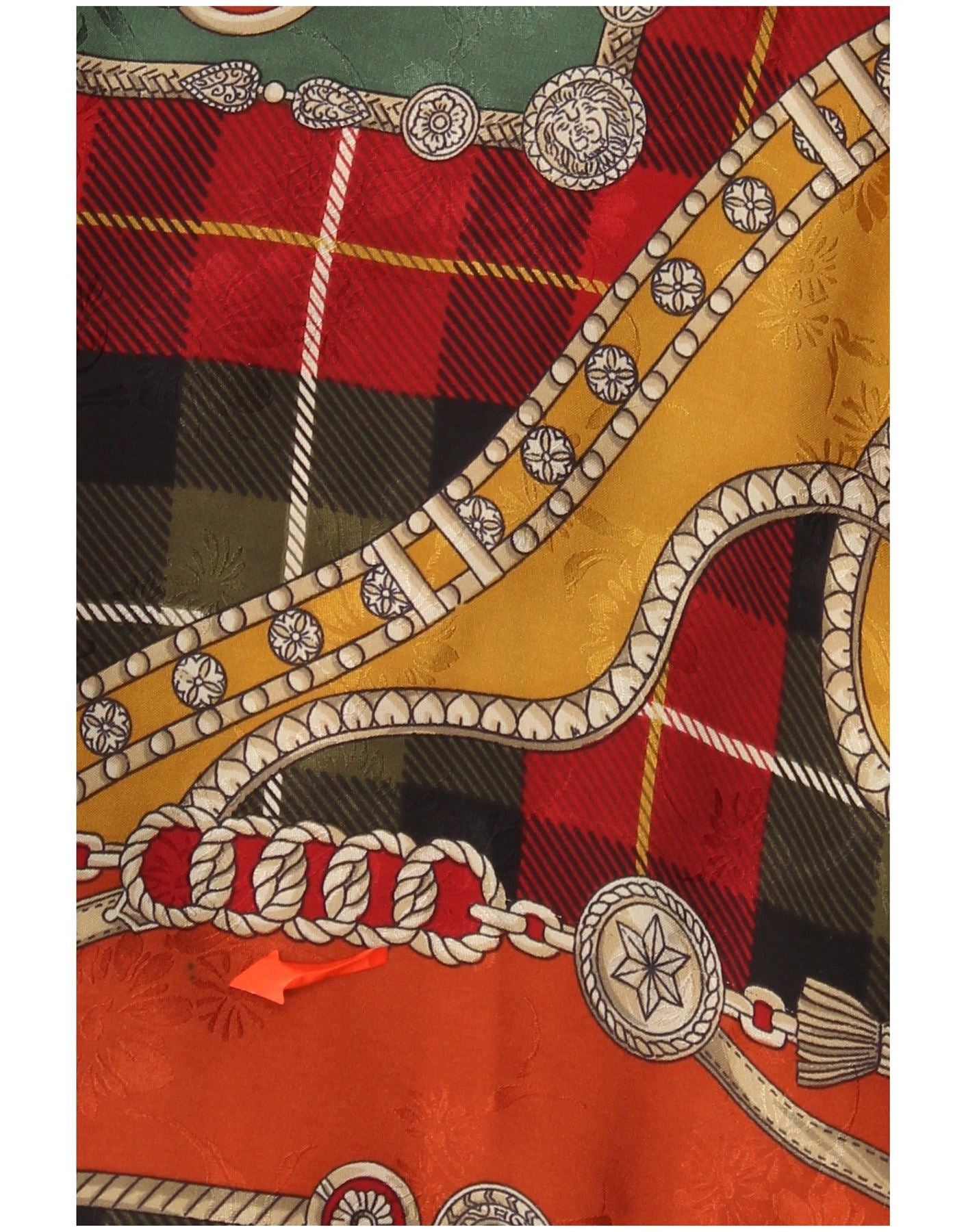 - Descriere AI: Această cămașă Vintage pentru femei este confecționată dintr-o țesătură jacquard multicoloră, cu o senzație bogată și texturată. Are un decolteu clasic cu guler și mâneci lungi. Potrivirea lejeră oferă o siluetă relaxată. Designul prezintă un model abstract complex, îmbinând carouri cu lanț decorativ și motive ecvestre. Partea frontală completă cu nasturi adaugă detalii tradiționale. Această piesă în stil retro oferă un aspect distinctiv și confortabil.