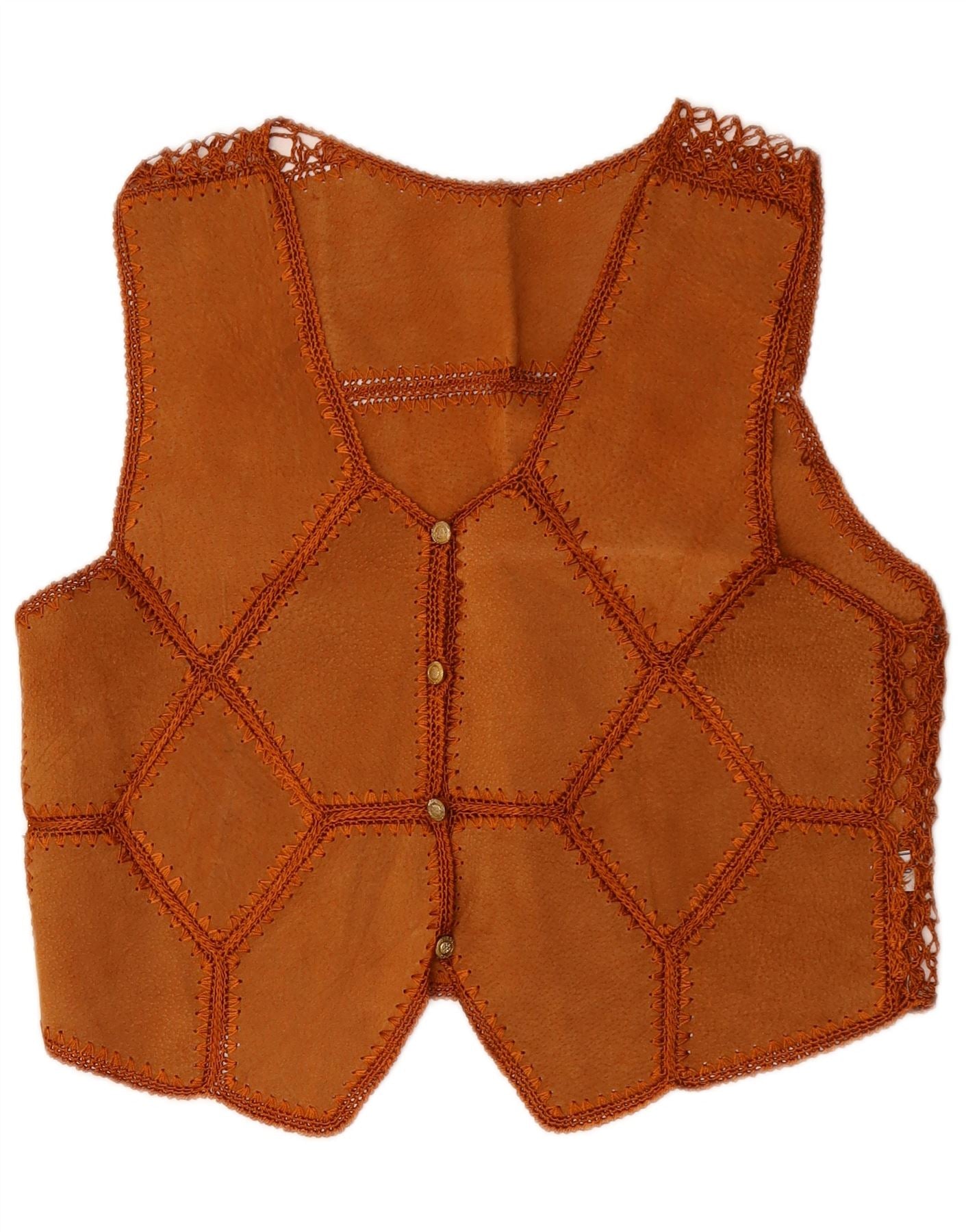 VINTAGE Vestă crop din piele intoarsa pentru femei UK 14 Medium Brown Patchwork