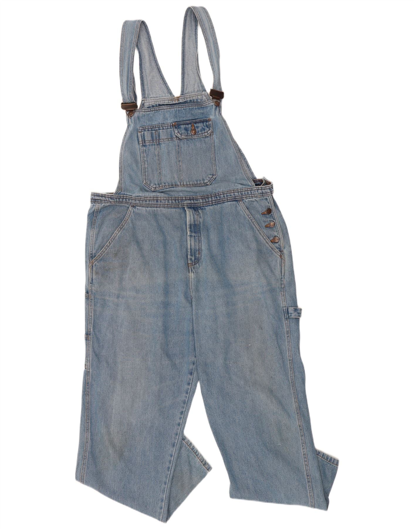 - AI Description: This Vintage womens jumpsuit is crafted from classic blue denim, offering a durable yet comfortable feel. It features a sleeveless design, perfect for versatile layering or warmer days. The regular fit ensures ease of movement and a flattering silhouette. Buckle fastenings provide a secure and adjustable closure. Practical pockets add functional detail. Button accents subtly enhance the overall classic style.