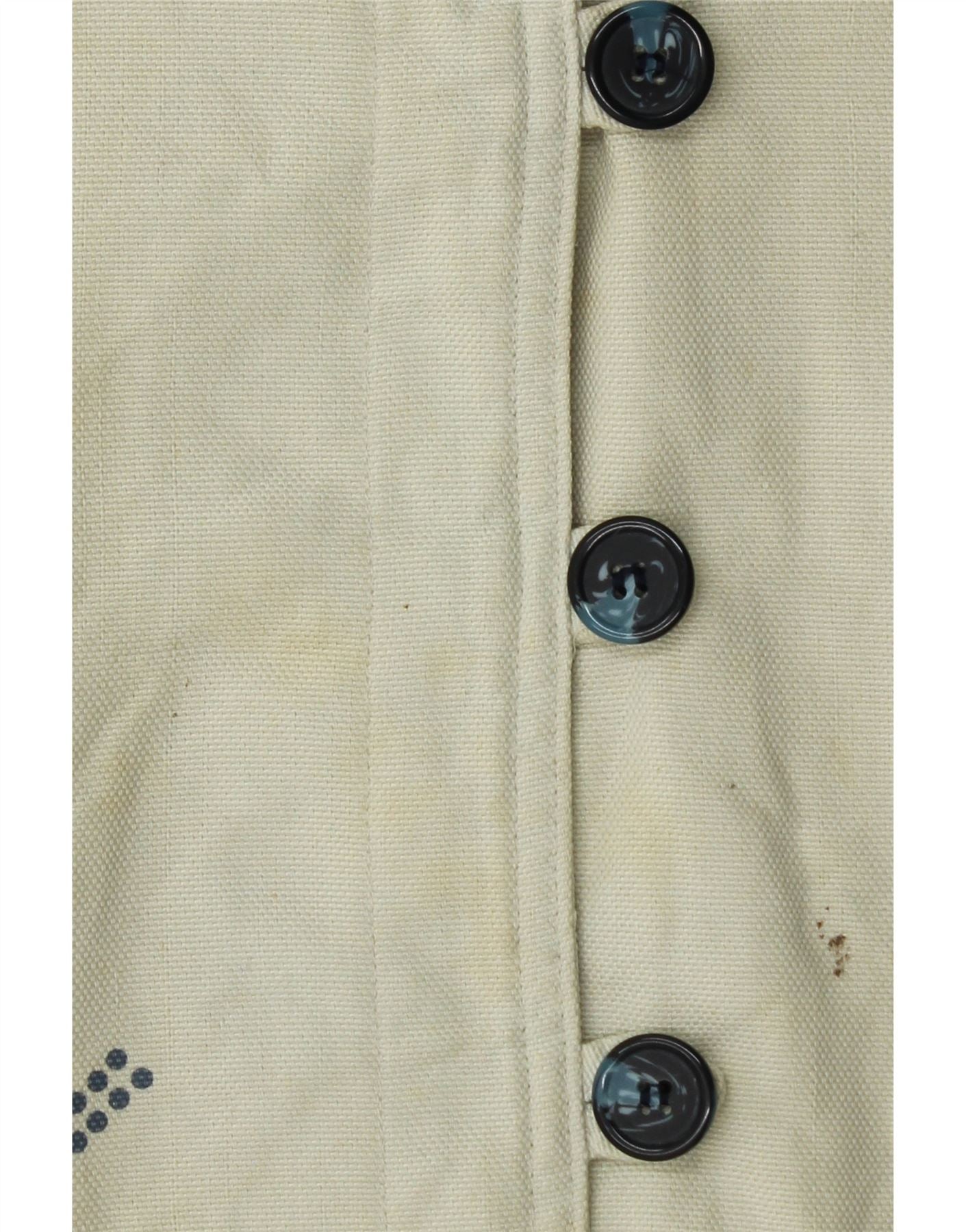 - Descriere AI: Această jachetă Vintage pentru femei este confecționată din țesătură de bumbac 80%, într-o nuanță albă. Are un decolteu cu guler și mâneci lungi. Potrivirea obișnuită oferă o purtare confortabilă. Un model geometric cu tonuri de albastru și gri împodobește mânecile și tivul. Accentele brodate evidențiază partea din față. Închiderile cu cinci nasturi completează designul, adăugând o notă de stil etnic.