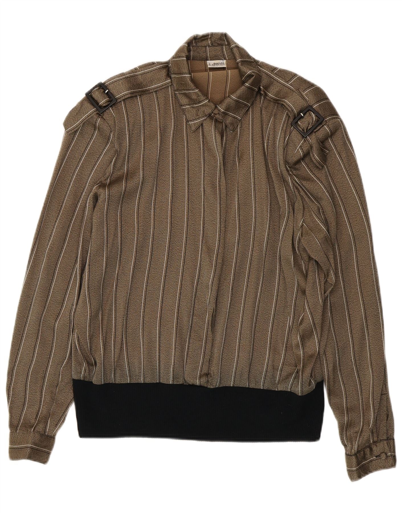 - Descriere AI: Această bluză de cămașă Vintage pentru femei este realizată din mătase luxoasă kaki, oferind o textură netedă, țesătură. Prezintă un model distinctiv în dungi. Decolteul cu guler și închiderea cu nasturi oferă detalii clasice. Mânecile lungi sunt finisate cu încheieturi cu mansete, accentuate de catarame pentru o atingere unică. Potrivirea obișnuită asigură o purtare confortabilă. Tivul negru cu nervuri adaugă un contrast modern acestei piese de inspirație retro.
