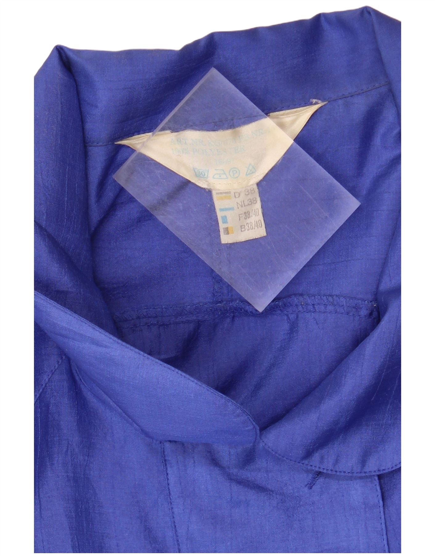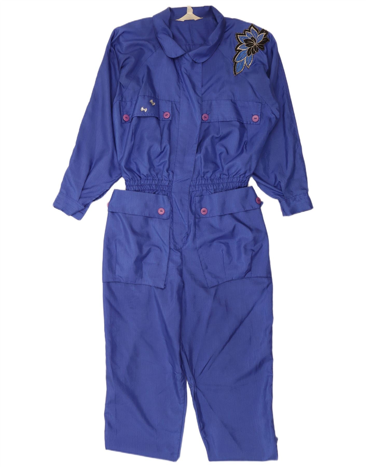 - AI Description: This Vintage womens jumpsuit is crafted from 100 percent polyester woven fabric in a rich blue hue. It features a collared neckline and long sleeves. The relaxed fit and elastic waist ensure comfort. Button closure adds a classic touch. Practical pockets are included. An embroidered accent provides subtle detailing. The retro style offers a distinctive look.