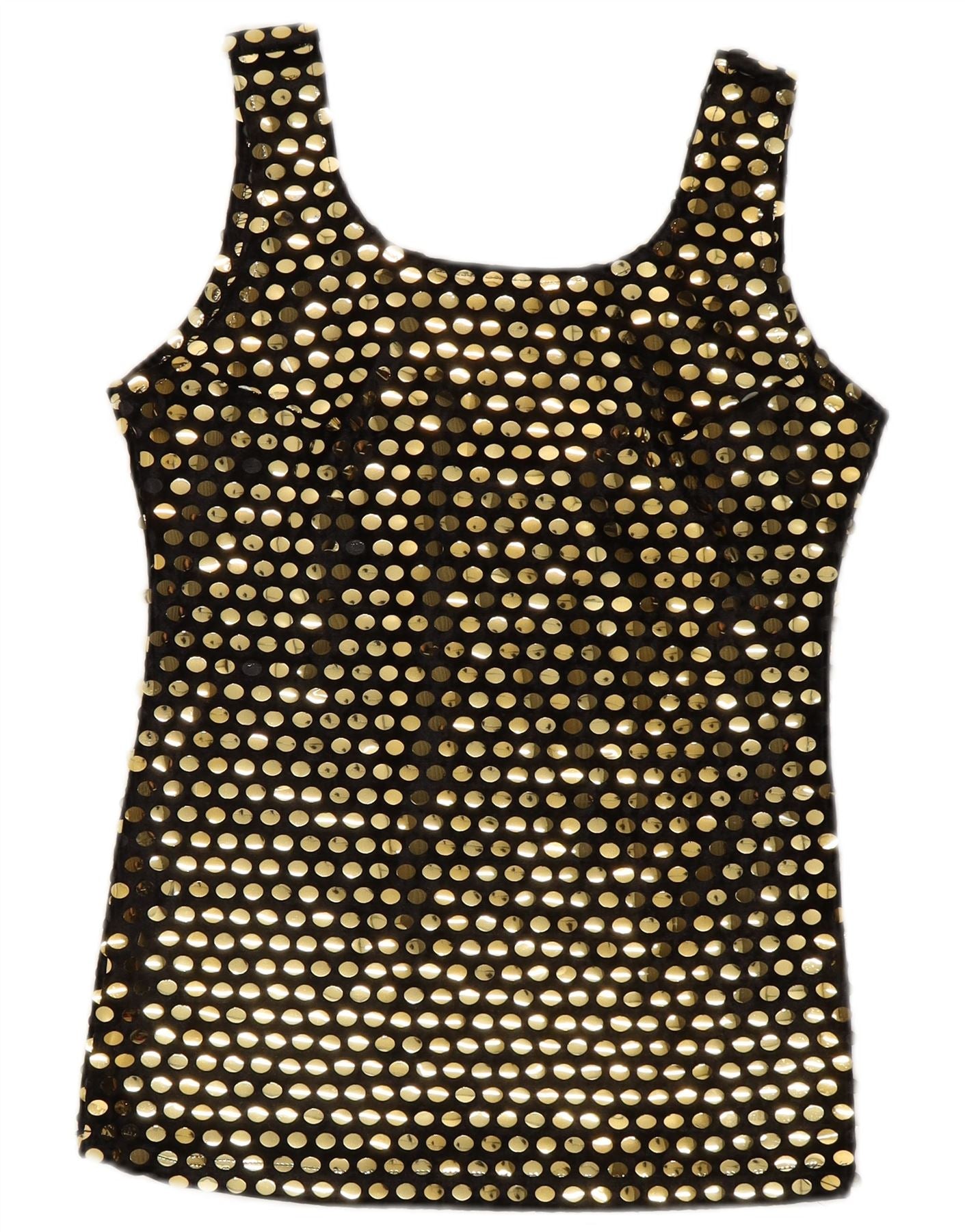 - Descriere AI: Acest Top Vest Vintage pentru femei este realizat din tricot 100% poliester. Prezinta o impodobire cu paiete auriu pe o baza neagra, creand un efect multicolor izbitor. Topul are un gât rotund clasic și un design fără mâneci. Oferă o potrivire regulată pentru o purtare confortabilă. Acest stil de pulover este perfect pentru ținuta de festival, adăugând o notă de strălucire și glamour.
