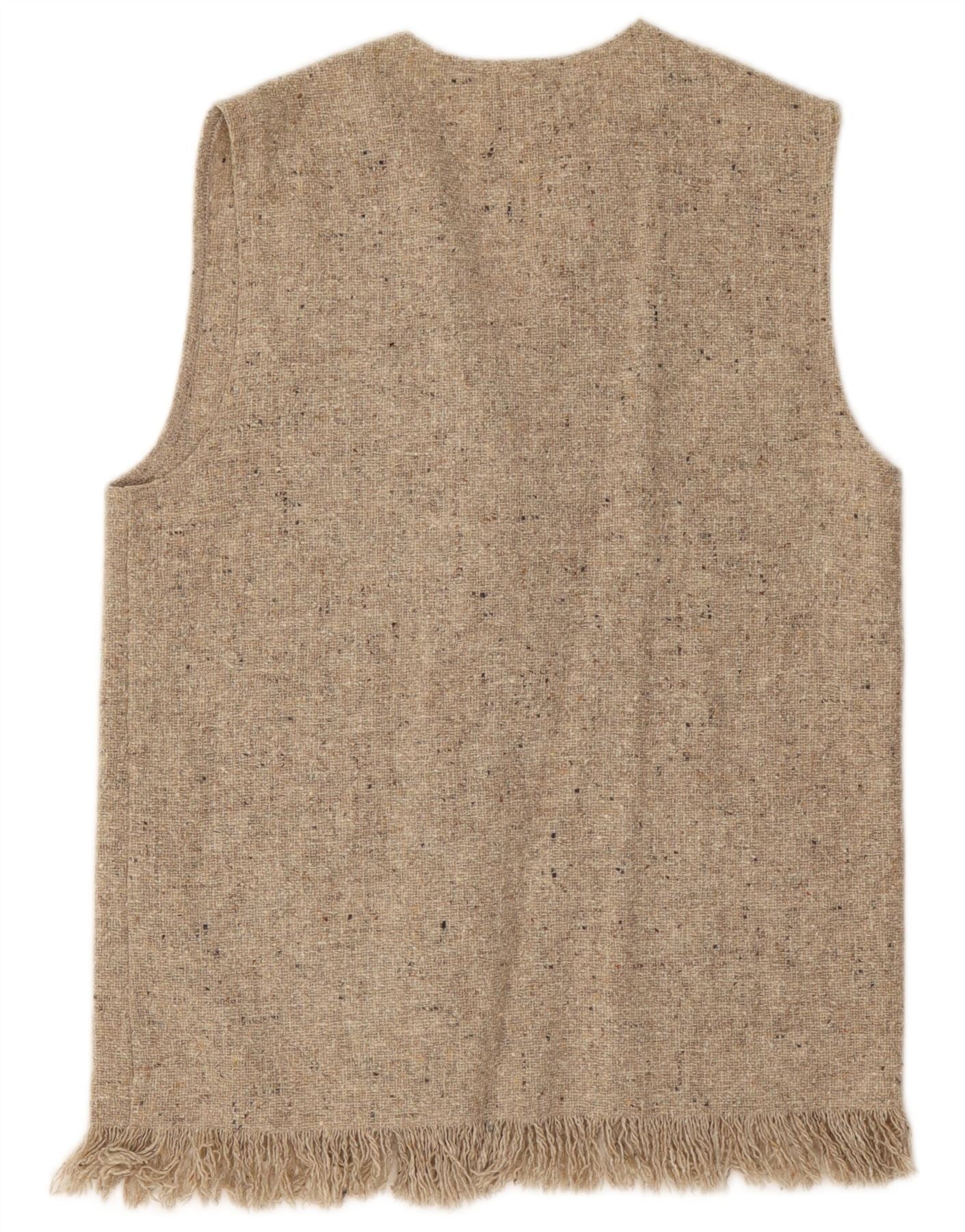 - Descriere AI: Această vestă de damă Chagal este confecționată dintr-un amestec bej de lână tweed, oferind o textură bogată, pete. Are un decolteu clasic în V și un design fără mâneci. Potrivirea obișnuită asigură o purtare confortabilă. Un nasturi în față oferă o închidere îngrijită. Sunt incluse buzunare practice. Tivul este finisat cu un accent distinctiv de franjuri, adăugând o notă unică.