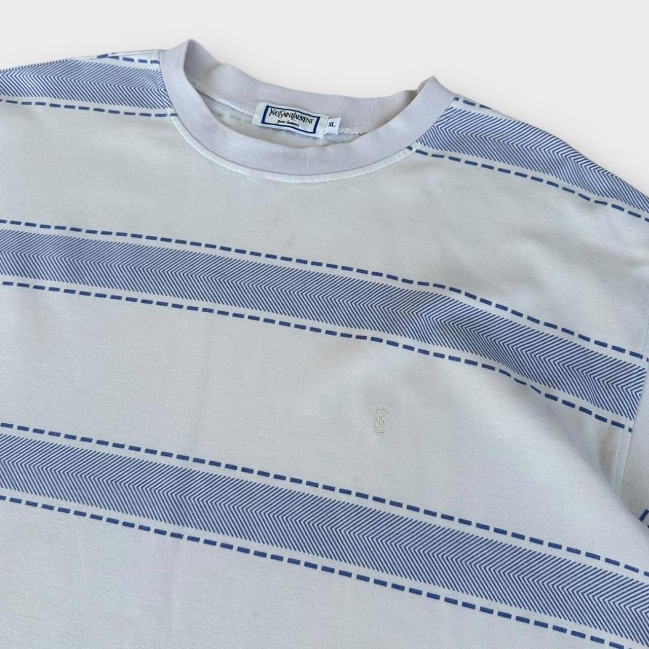 Tricou vintage Yves Saint Laurent cu dungi albastre și albe, cu logo brodat pe piept