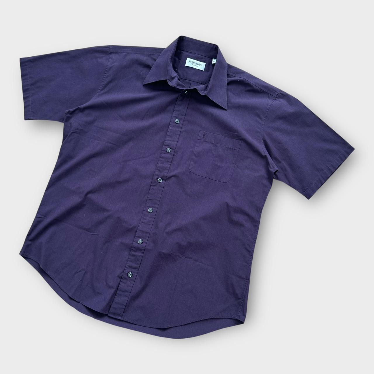 Cămașă vintage cu mânecă scurtă Yves Saint Laurent, de la începutul anilor 2000, de culoare maro/violet, cu logo brodat pe piept