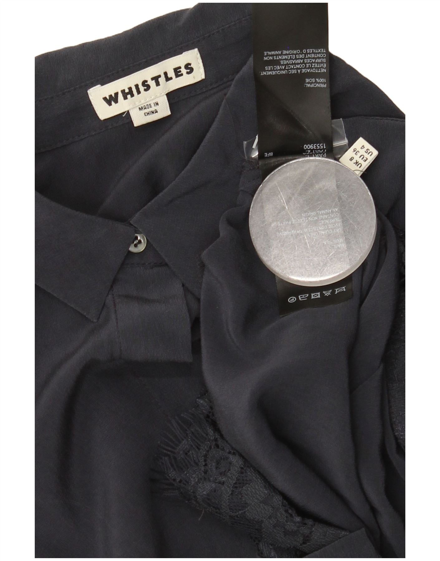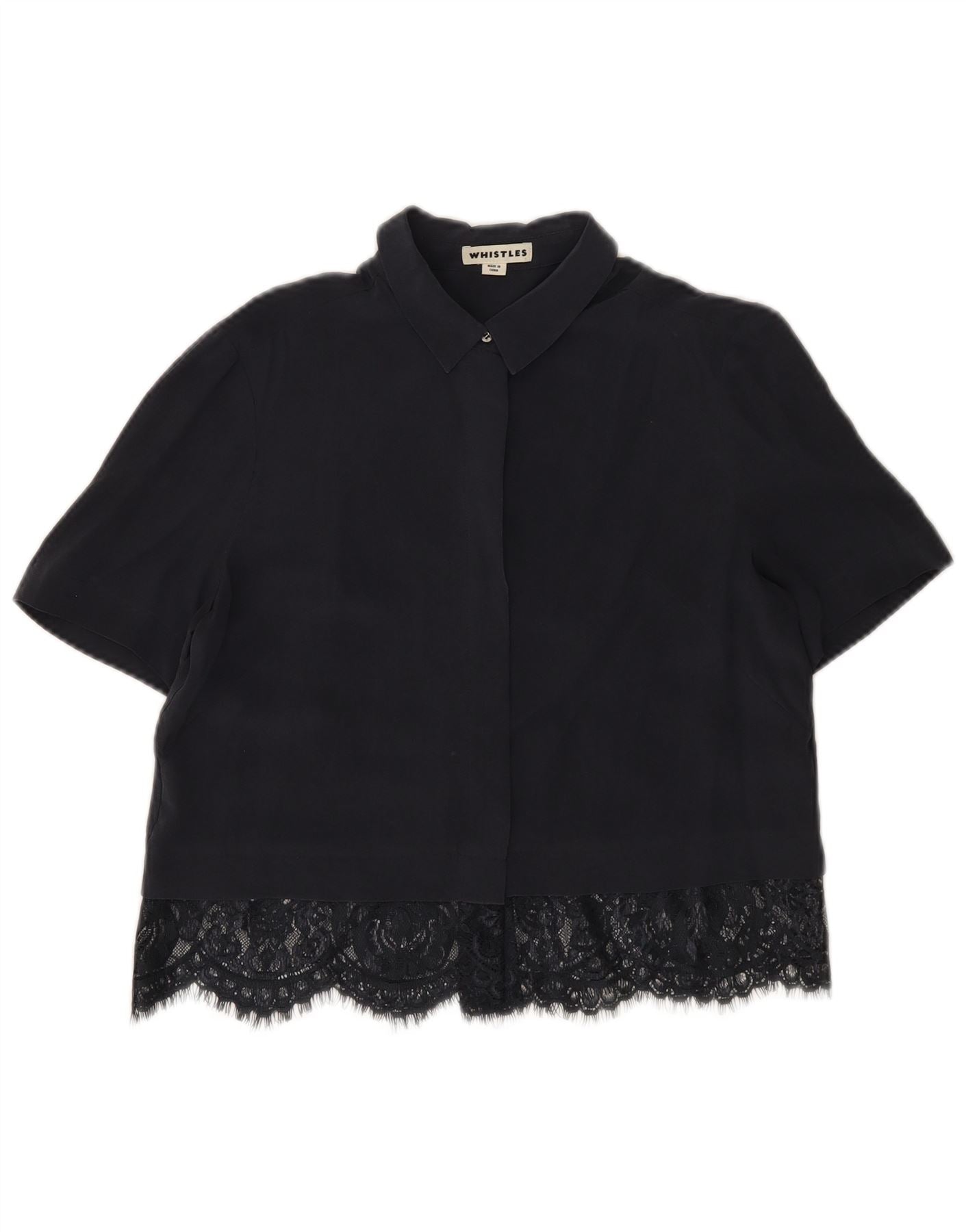 - AI Description: This Whistles womens shirt blouse is crafted from luxurious 100 percent silk, offering a smooth, woven texture. Presented in a sophisticated navy blue, it features a classic collared neckline and short sleeves. The button-up front ensures a neat finish. Delicate lace detailing adds a refined accent. Its relaxed fit provides comfortable elegance for a versatile wardrobe.