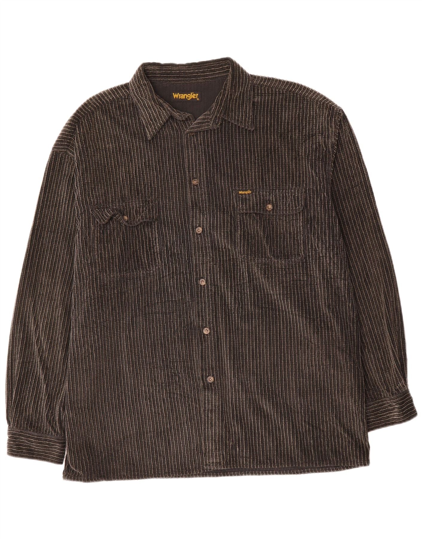 - AI Description: This Wrangler mens corduroy shirt is crafted from soft grey corduroy, offering a tactile, ribbed texture. It features a classic collared neckline and a full button-up front. Long sleeves provide ample coverage, ideal for layering. The relaxed fit ensures comfortable wear and easy movement. Practical pockets adorn the chest, complemented by a subtle brand logo. This shirt blends classic style with everyday utility.