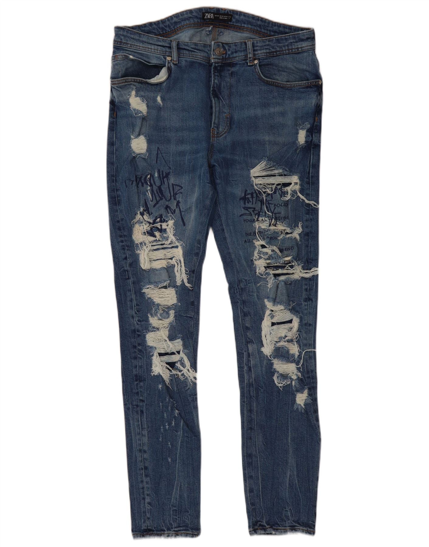 Blugi subțiri cu grafică învechită ZARA pentru bărbați EU 44 Mari L34 L30 Albastru