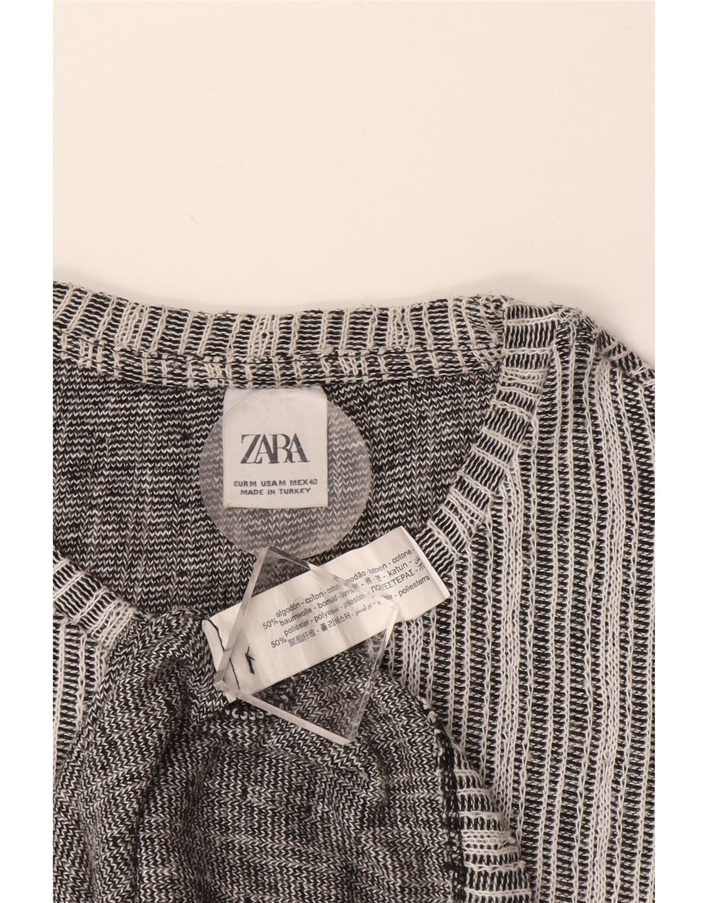 - Descriere AI: Acest tricou pentru bărbați Zara este confecționat dintr-o țesătură confortabilă din amestec de bumbac și poliester. Are un gât rotund clasic și mâneci scurte pentru purtarea de zi cu zi. Potrivirea regulată asigură o siluetă relaxată. Un model distinctiv cu dungi în alb și negru adaugă interes vizual modern. Acest pulover oferă atât confort, cât și respirabilitate, perfect pentru un look casual contemporan.