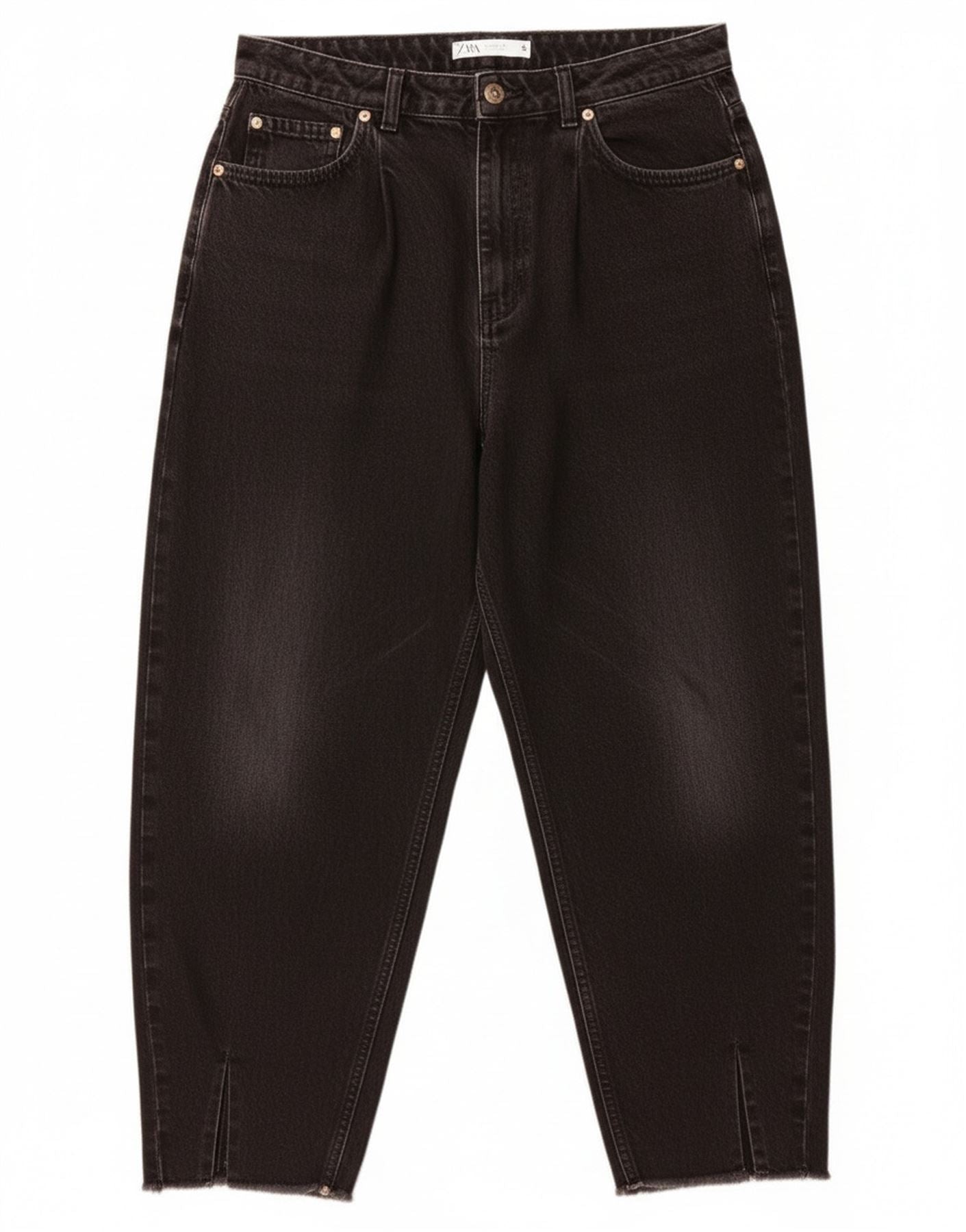 - Descriere AI: Acești blugi Zara de damă cu talie înaltă sunt confecționați din denim negru, cu un finisaj învechit. Au talie înaltă și închidere cu nasturi. Potrivirea relaxată prin șold se îngustează spre gleznă. Sunt incluse buzunare practice. Un logo subtil al mărcii adaugă o notă de semnătură. Stilul anilor 90 este evident în croială.