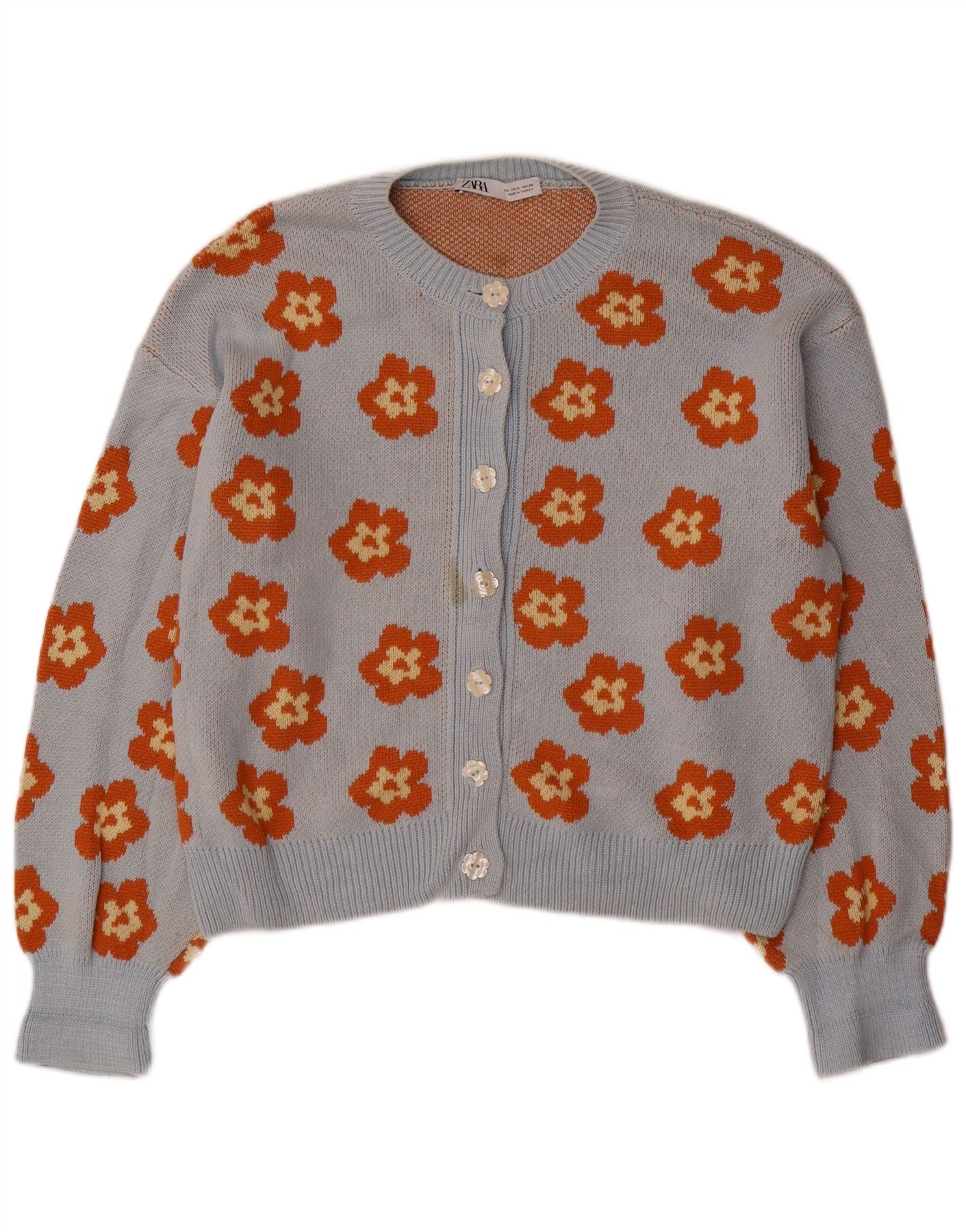 - Descriere AI: Acest pulover cardigan pentru femei Zara este realizat dintr-o țesătură moale de tricot albastru. Prezintă un model floral vibrant în tonuri portocalii. Decolteul rotund și mânecile lungi oferă o siluetă clasică. Partea frontală completă cu nasturi cu nasturi tonuri oferă o închidere elegantă. Potrivirea obișnuită asigură o purtare confortabilă, îmbinând stilul retro cu aspectul modern.