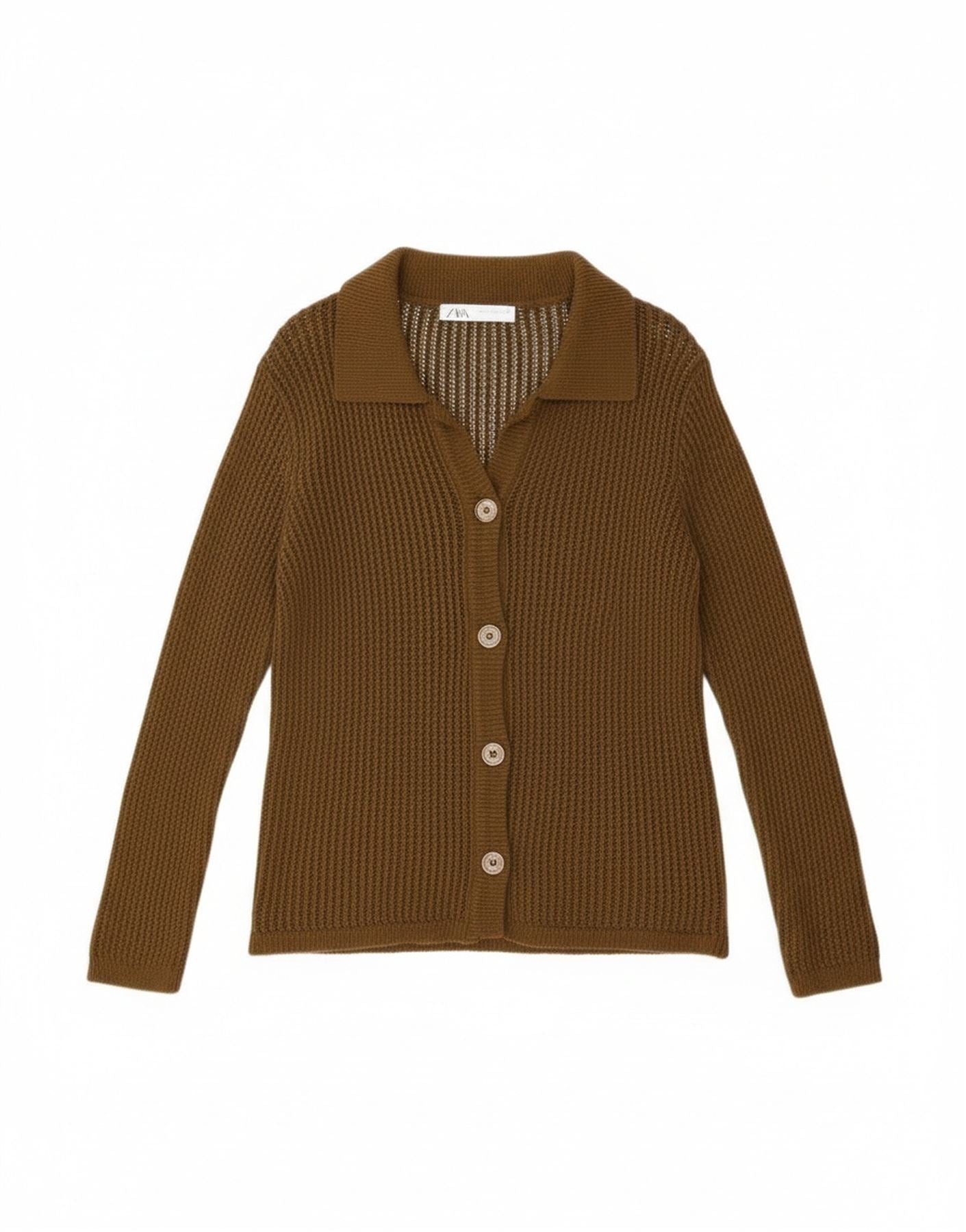- Descriere AI: Acest pulover cardigan de damă Zara este confecționat dintr-o țesătură maro, deschisă, oferind o senzație texturată, dar ușoară. Are un decolteu clasic cu guler și mâneci lungi. Partea frontală cu nasturi oferă o închidere versatilă. Nasturii pe tonuri trec pe partea din față, adăugând detalii subtile. Potrivirea sa obișnuită asigură o purtare confortabilă, făcându-l o piesă de stratificare versatilă.