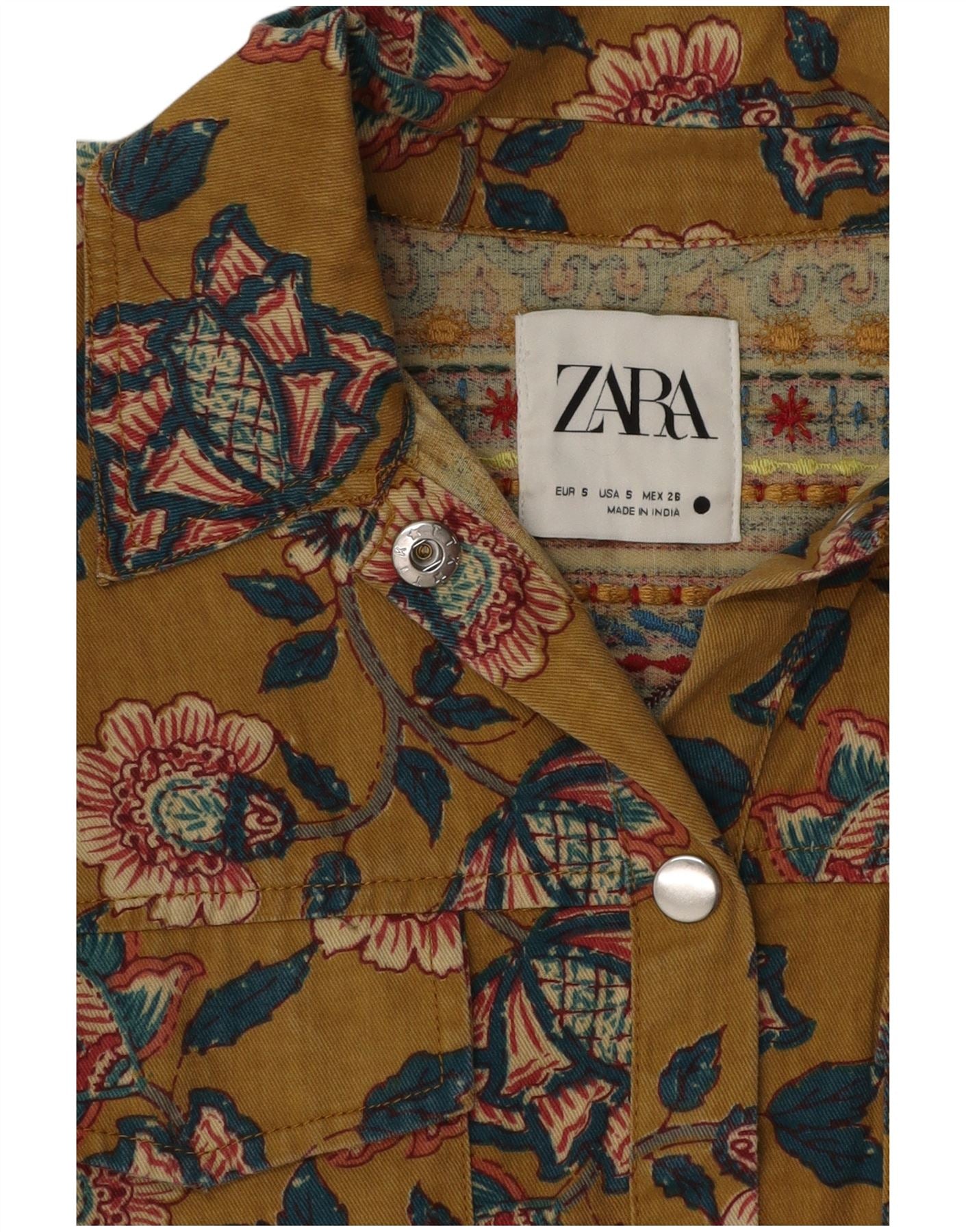 - Descriere AI: Această cămașă din denim pentru femei Zara are o bază galben vibrant, cu un model floral complicat. Fabricat din denim, oferă o textură durabilă, dar elegantă. Are un decolteu clasic cu guler și mâneci lungi. Potrivirea obișnuită asigură o purtare confortabilă. Închiderile cu apăsare asigură un finisaj elegant. Buzunarele practice adaugă funcționalitate. Un accent brodat îi sporește farmecul boem.