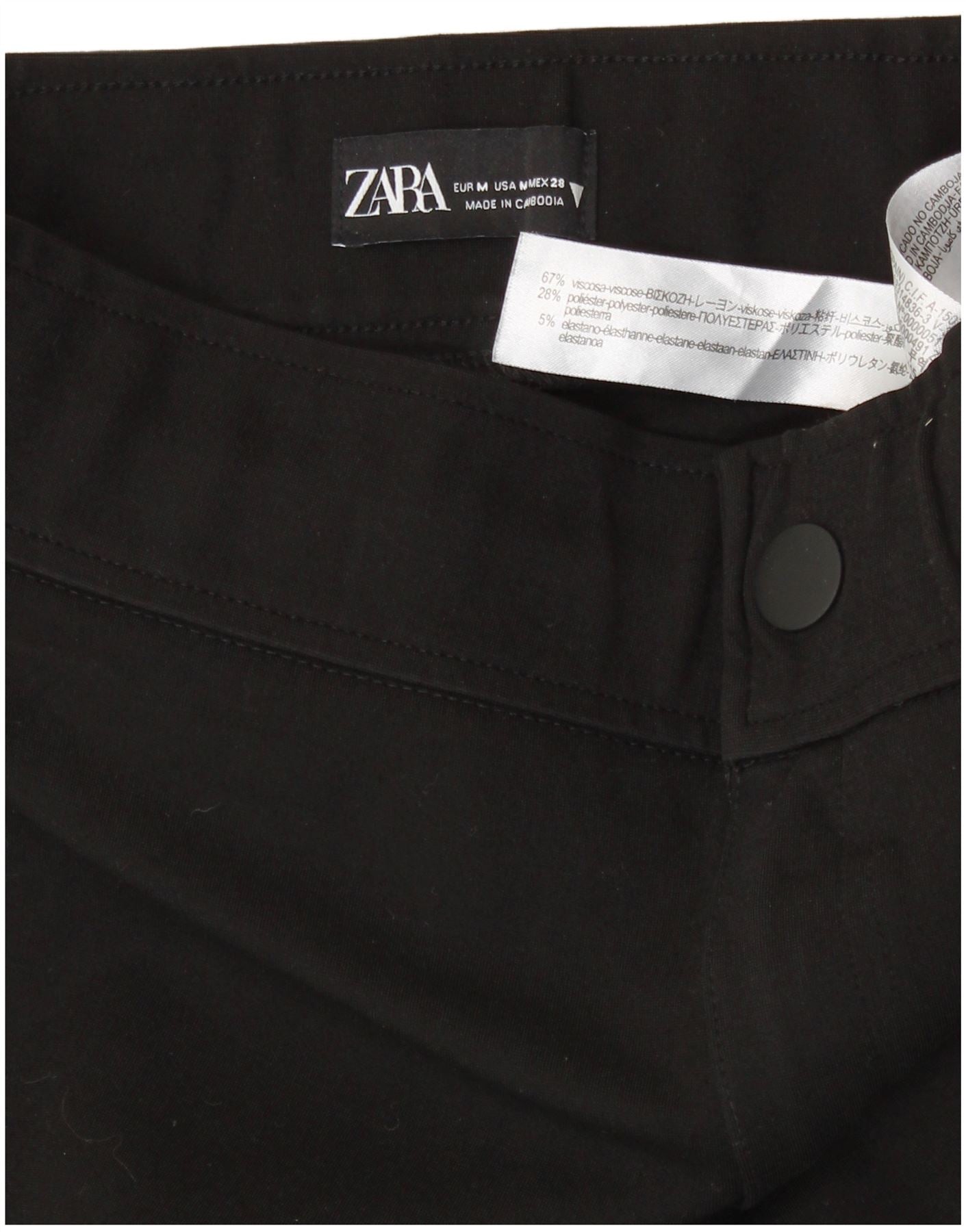 - Descriere AI: Acești pantaloni de damă Zara sunt confecționați din țesătură cu un plus de elasticitate. Designul slim fit are o închidere prin tragere și talie elastică pentru confort. Acești pantaloni negri au o siluetă elegantă. De asemenea, au buzunare practice. Compoziția materialului este 67% viscoză, 28% poliester și 5% elastan.